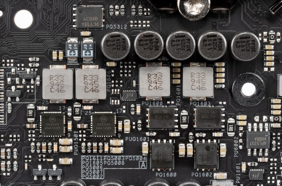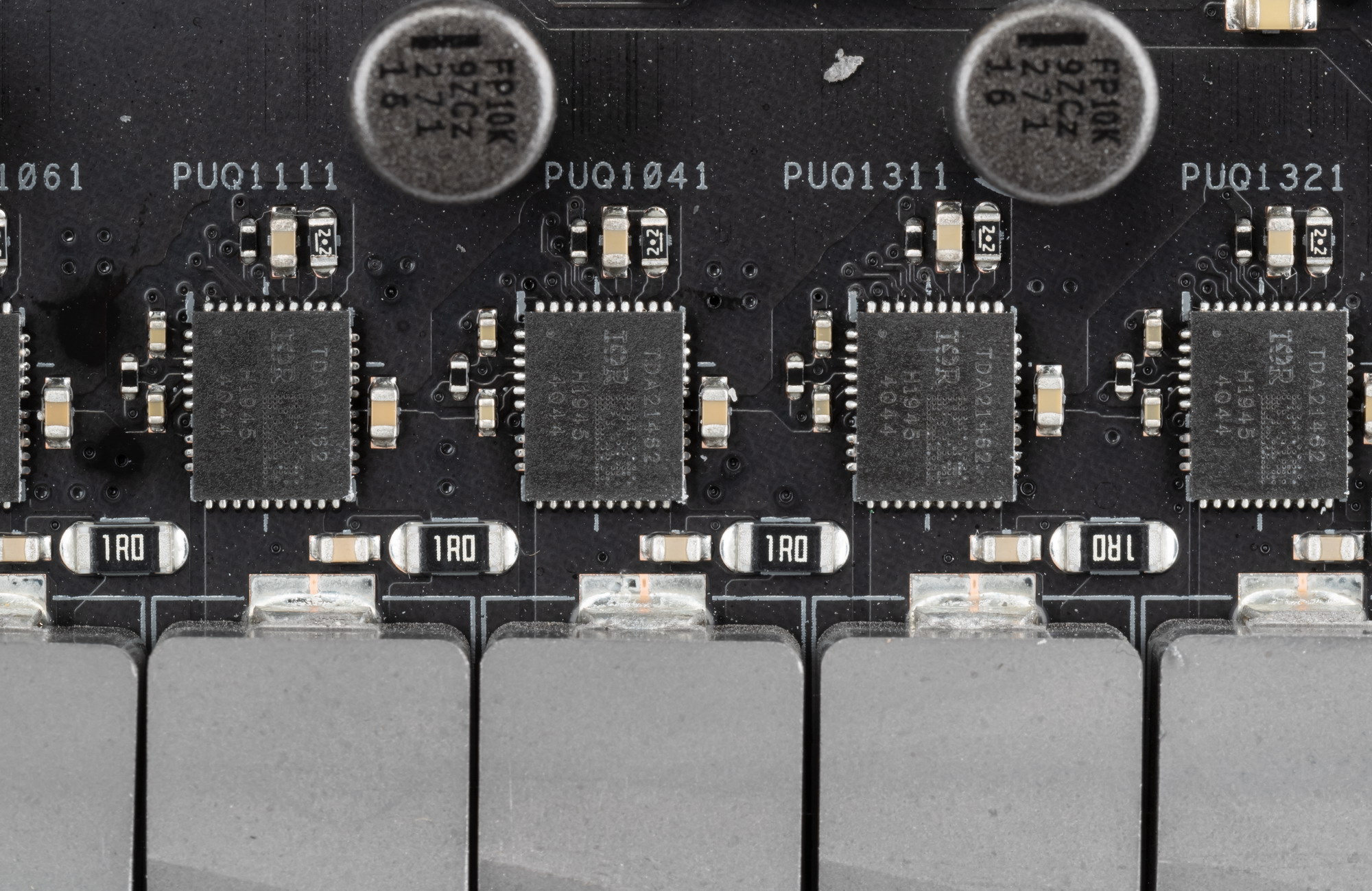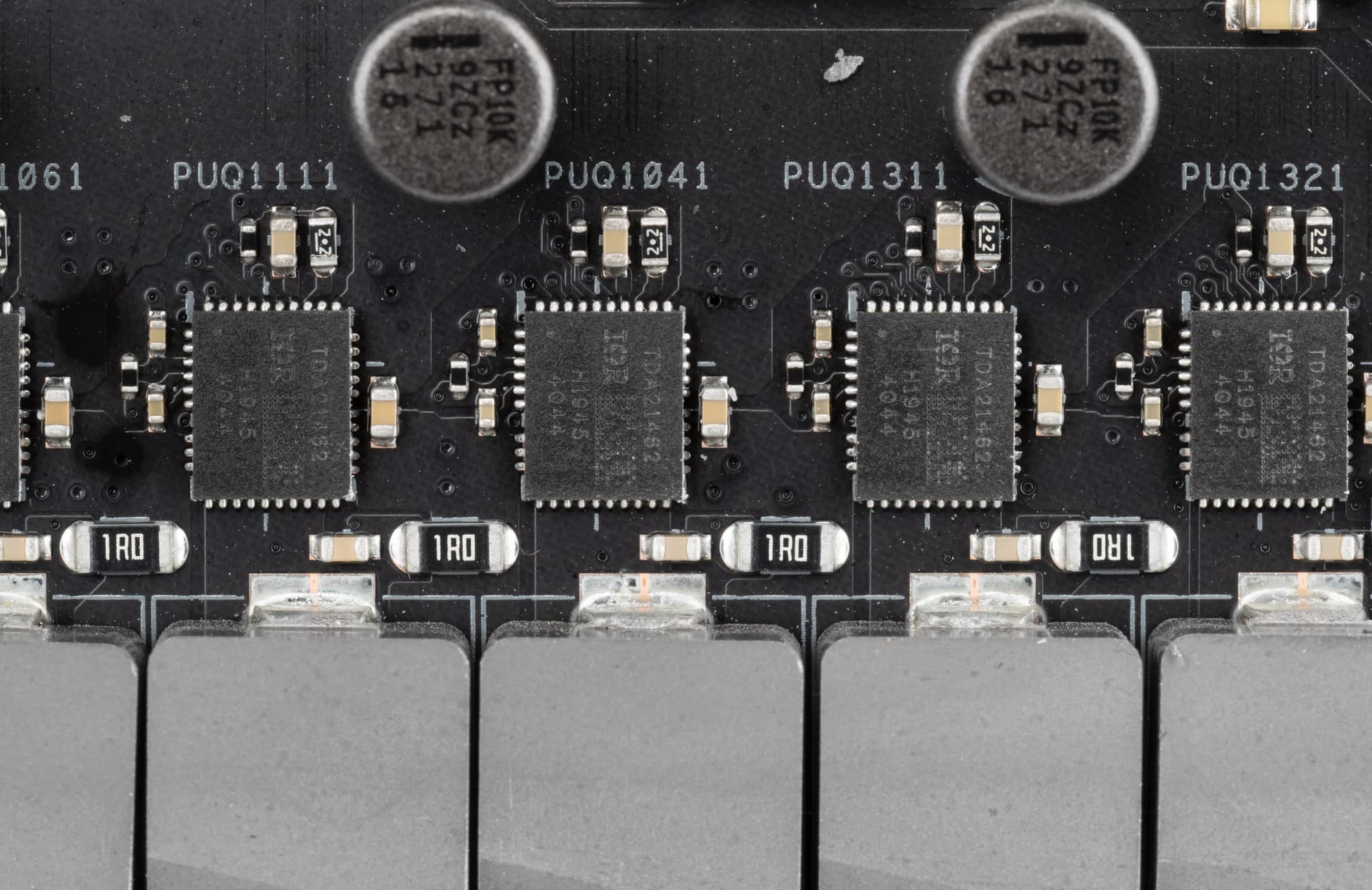 Каждый канал фазы имеет суперферритовую катушку и TDA21462 MOSFET от International Rectifier.