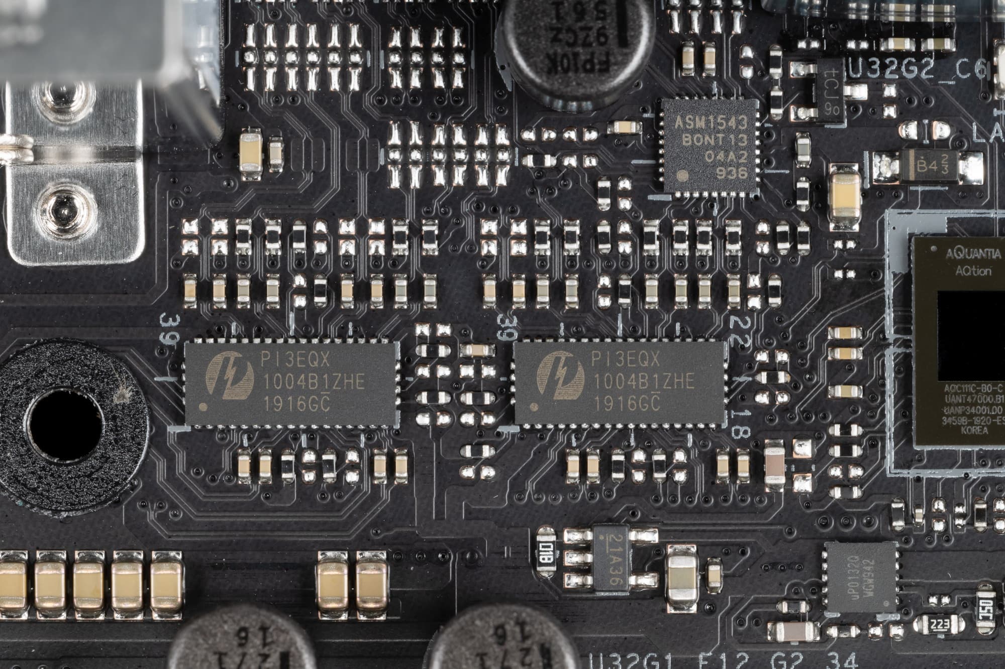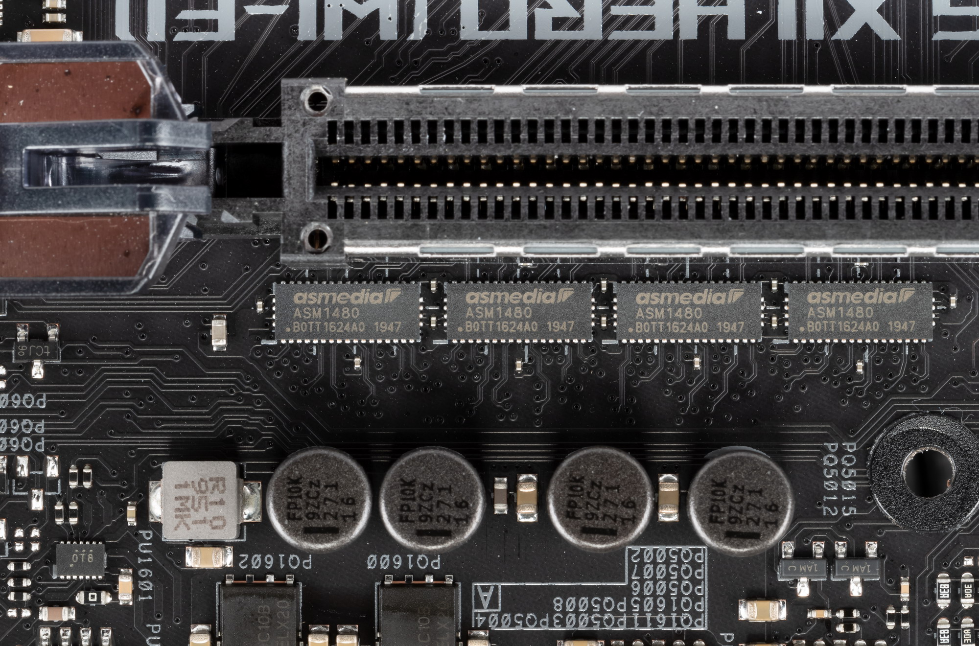 У данной платы распределение линий PCIe между слотами в случае использования более одной видеокарты, - достаточно витиеватое, а также необходимо переключение слотов PCIe x16_3 и портов SATA, поэтому востребованы мультиплексоры ASM1480 от ASMedia.