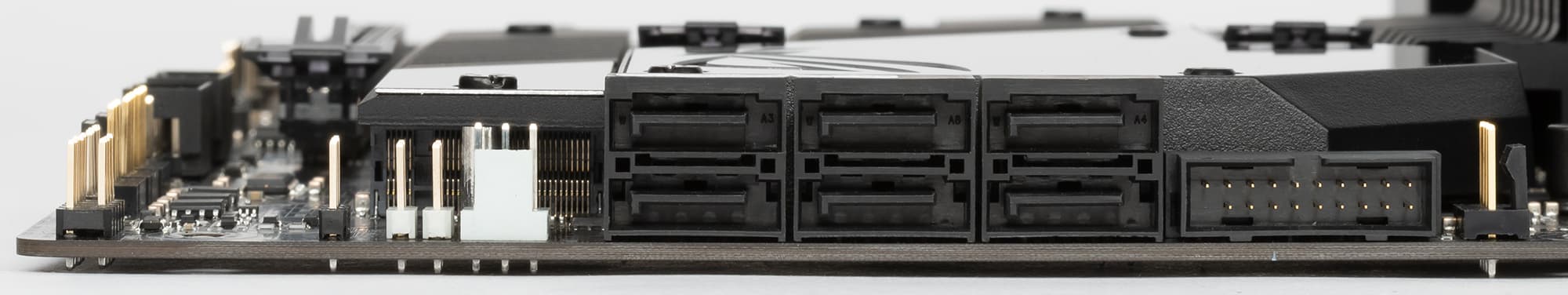Всего у платы 6 разъемов Serial ATA 6 Гбит/с + 3 слота для накопителей в форм-факторе M.2. (Еще один слот M.2, спрятанный под кожухом блока разъемов задней панели, занят контроллером беспроводных сетей Wi-Fi/Bluetooth.). Все порты SATA реализованы через чипсет Z490 и поддерживают создание RAID.