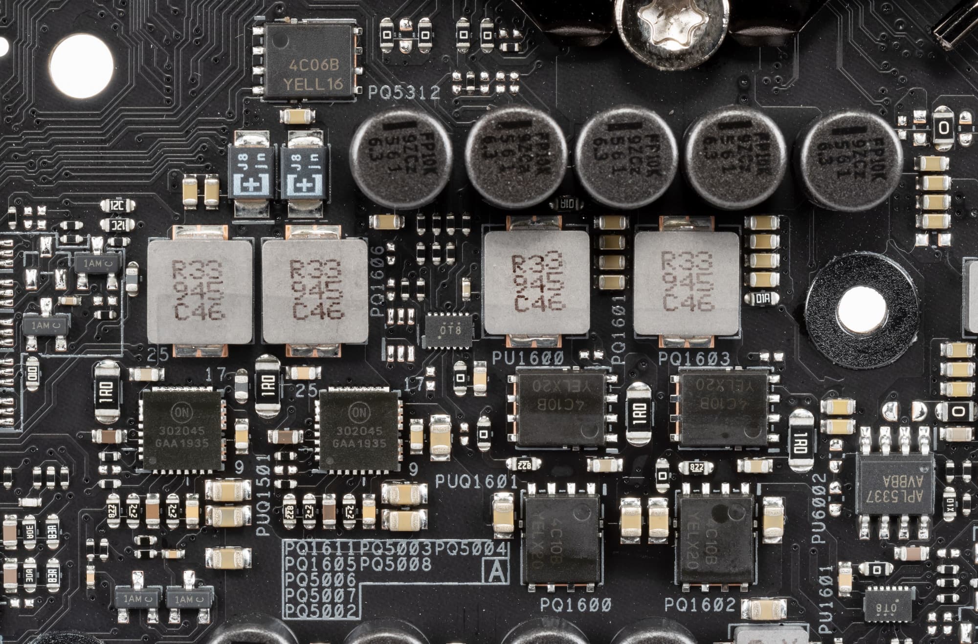 Система питания очень внушительная (для сегмента ниже HEDT это просто монстр). Схема питания ядра выполнена по 16 фазной схеме.