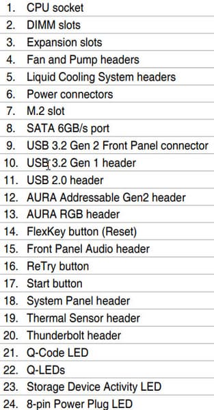 | Прочие внутренние элементы | 24-контактный разъем питания ATX 1 8-контактный разъем питания EPS12V 1 4-контактный разъем питания EPS12V 1 слот M.2 (E-key), занят адаптером беспроводных сетей 1 разъем для подключения порта USB 3.2 Gen2 Type-C 1 разъем для подключения 2 портов USB 3.2 Gen1 2 разъема для подключения 4 портов USB 2.0 8 разъемов для подключения 4-контактных вентиляторов и помп ЖСО 2 разъема для подключения неадресуемой RGB-ленты 2 разъема для подключения адресуемой ARGB-ленты 1 разъем аудио для передней панели корпуса 1 разъем Thunderbolt 1 разъем для термодатчика 2 разъема для подключения управления с передней панели корпуса 1 кнопка Retry 1 кнопка включения питания Power 1 кнопка перезагрузки FlexKey (по умолчанию Reset) |