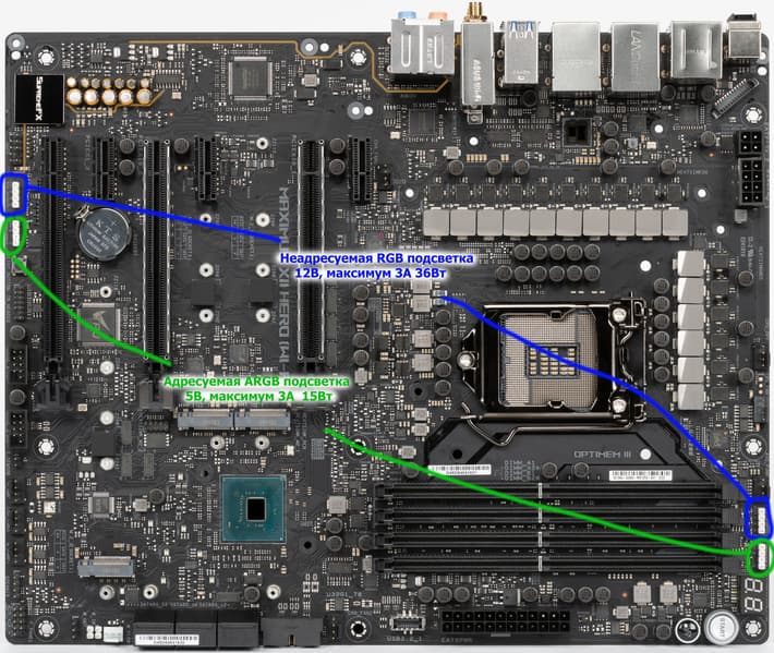 Еще в плюсы ROG Maximus XII Hero (Wi-Fi надо добавить неплохую подсветку, включая широкие возможности для подключения дополнительных RGB-устройств.