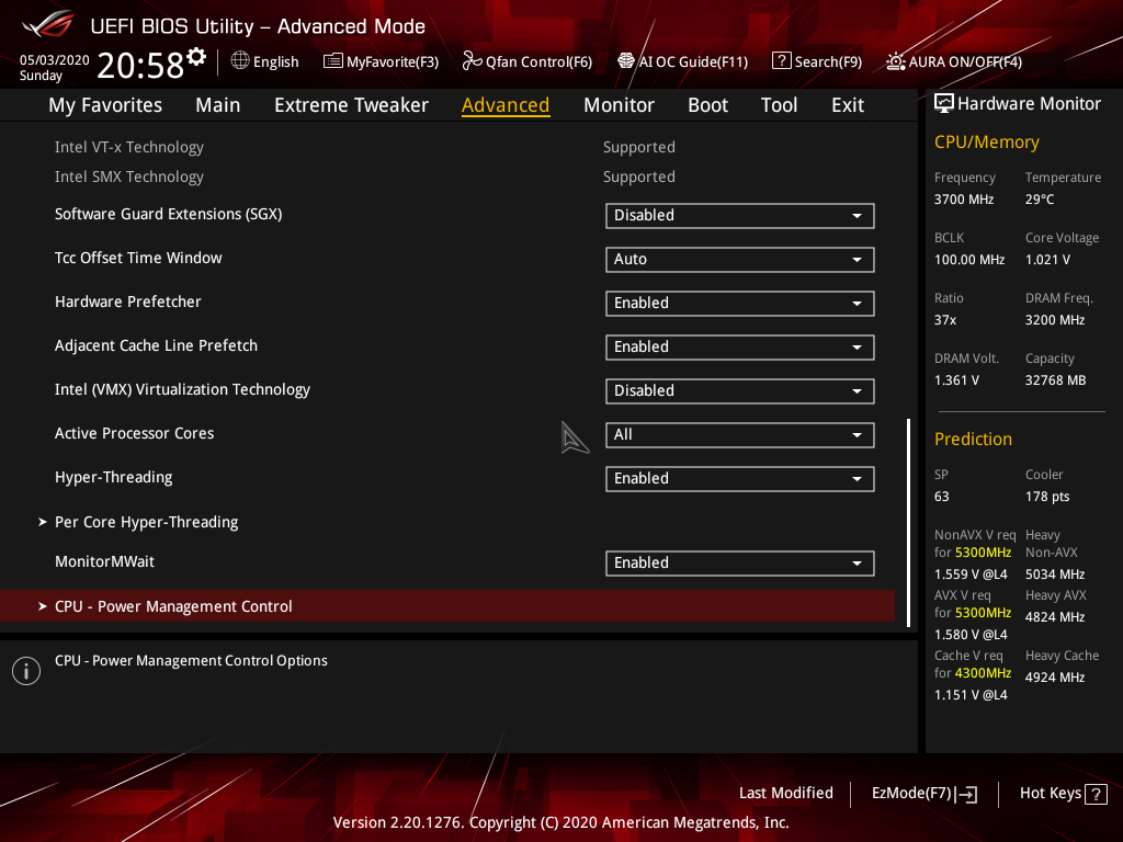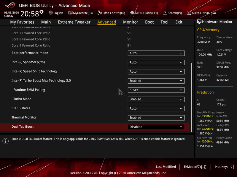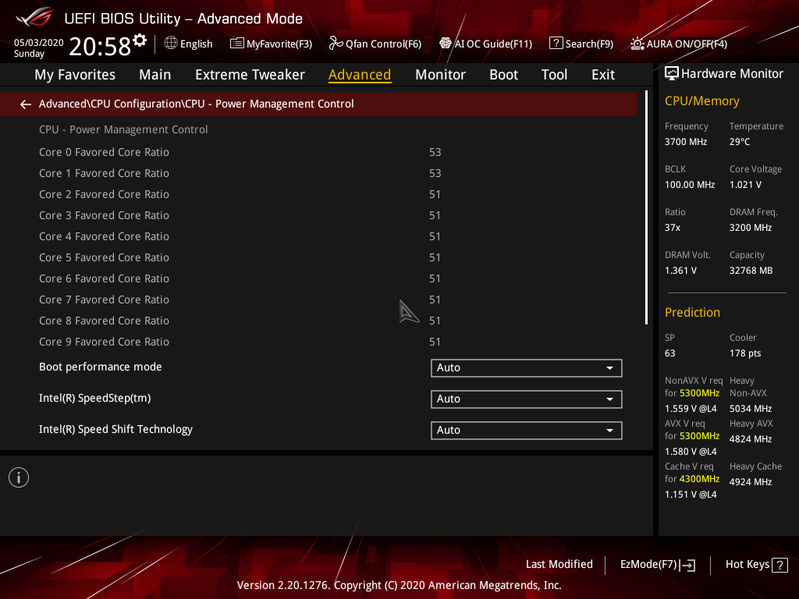 Ну вот, кстати, есть также больше поле опций для тех, кто, например, не желает авторазгона (TurboBoost) процессора, желая его работы только на минимальной штатной частоте (например, ради тихой работы СО). Кому-то помехой является технология SpeedShift, которая стремится при любой возможности понижать частоты работы ядер до 1200 МГц если нет активного использования CPU (ну типа энергосбережение). Следует особо отметить технологию Multi-Core Enhancement (MCE), которая базируется на той же TurboBoost, однако подразумевает снятие любых ограничений по энергопотреблению, то есть частоты работы CPU могут подниматься максимально, пока не наступит ограничение по нагреву. По умолчанию в данном случае установлено Auto (пользование настройками BIOS) — то есть, если нет выставления синхронизации частот по всем ядрам, максимумы частот будут появляться вразнобой. Если кому важно оставаться в заданных лимитах TDP, то MCE следует отключать.