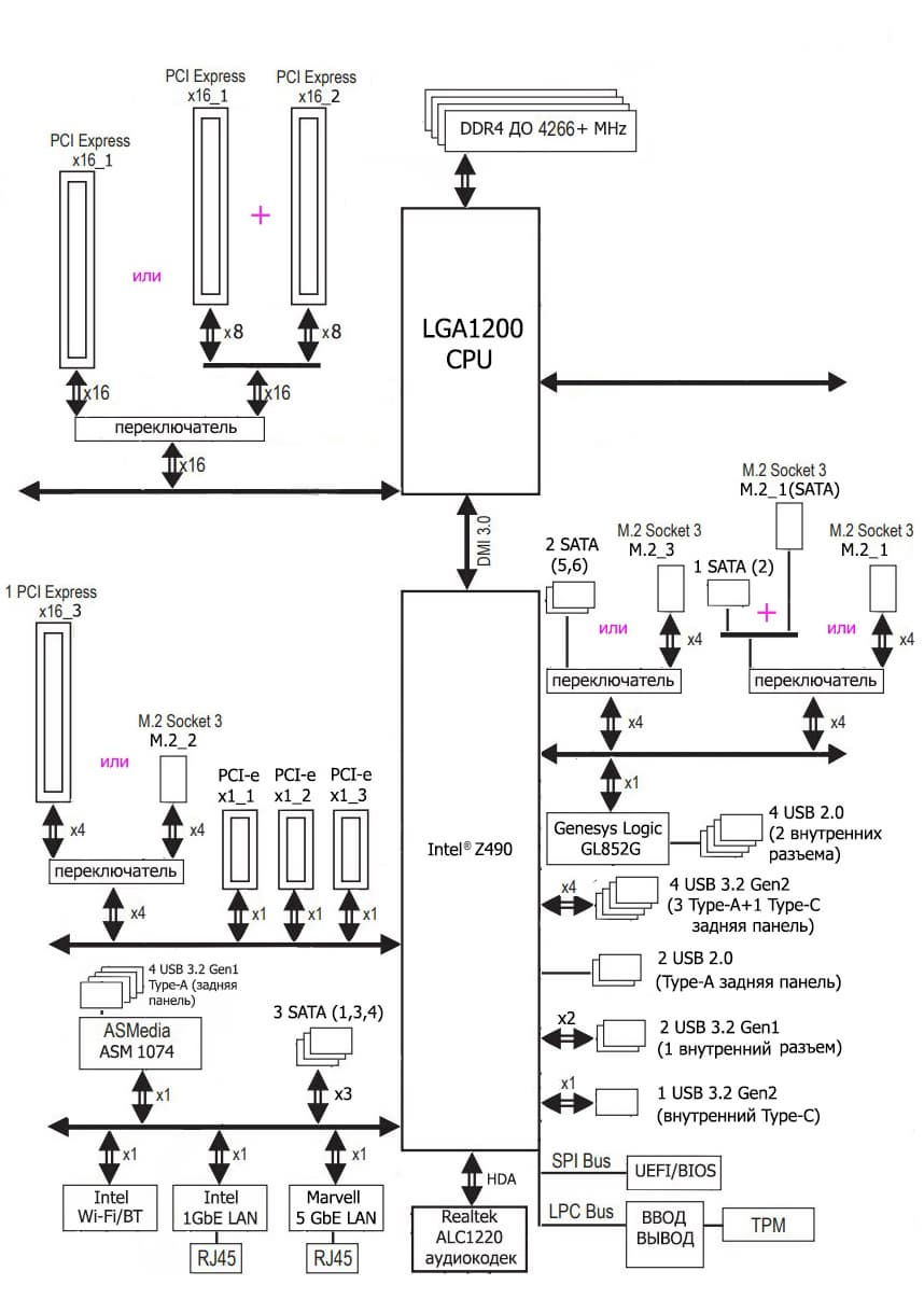 Процессоры Intel Core 10-го поколения (совместимые с сокетом LGA1200 и поддерживаемые Z490) имеют 16 линий ввода-вывода (включая PCIe 3.0), не имеют USB и SATA портов. При этом взаимодействие с Z490 идет по особому каналу Digital Media Interface 3.0 (DMI 3.0), и линии PCIe на это не расходуются. Все PCIe линии процессора идут на слоты расширения PCIe. Serial Peripheral Interface (SPI) используется для взаимодействия с системой UEFI/BIOS, а шина Low Pin Count (LPC) — для связи с устройствами ввода/вывода, не требующими высокой пропускной способности (контроллерами вентиляторов, TPM, старой периферии).