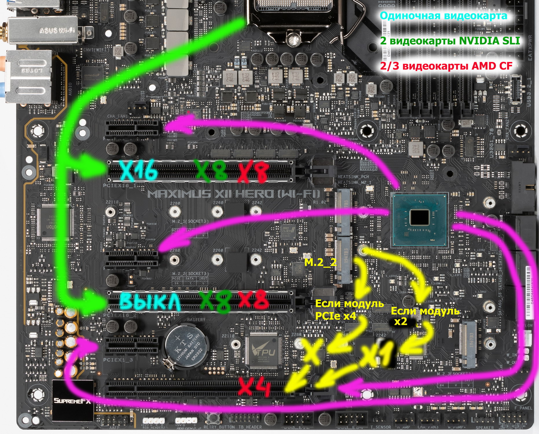 Единственный вариант установки трех видеокарт (а это поддерживает только AMD CrossFire) — это отказ от M.2_2. Тогда имеем схему Х8+Х8+Х4.