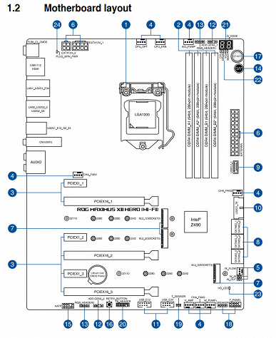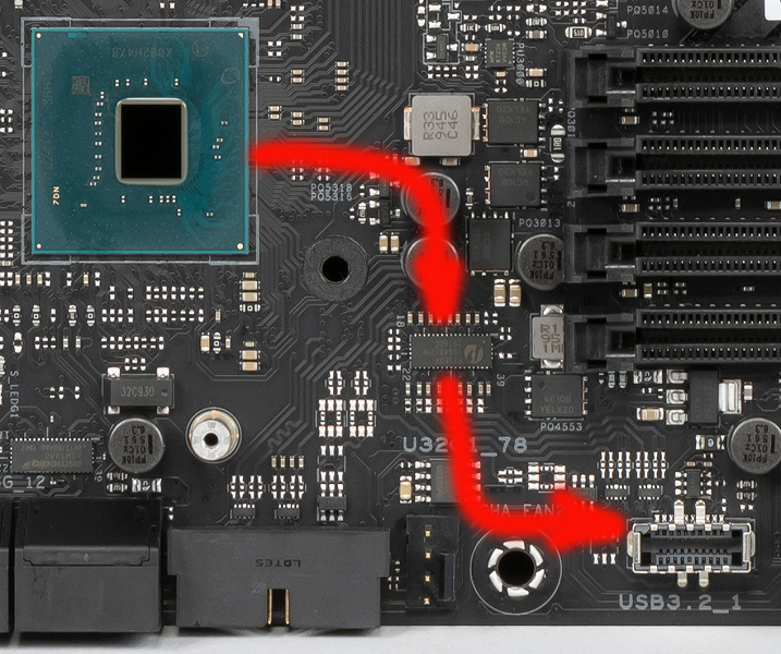 Итак, кроме USB-портов, к которым мы подойдем позже, чипсет Z490 обладает 24 PCIe линиями. Считаем, сколько линий уходит на поддержку (связь) с тем или иным элементом (надо учитывать, что из-за дефицита PCIe линий некоторые элементы периферии делят их, и потому использовать одновременно нельзя: для этих целей у материнской платы существует большое количество мультиплексоров):