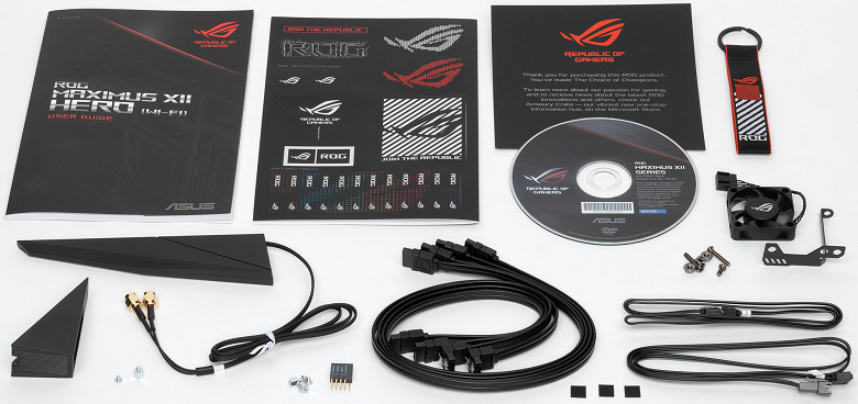 В комплекте поставки, кроме традиционных элементов типа руководства пользователя и кабелей SATA (что уже много лет является обязательным набором ко всем материнкам), есть выносная антенна с подставкой для беспроводных соединений, разветвители для подключения подсветок, винтики для монтажа модулей M.2, фирменный адаптер Q-Connector, дополнительный вентилятор с крепежом, накопитель типа CD, бонусные стикеры, брелок и наклейки.