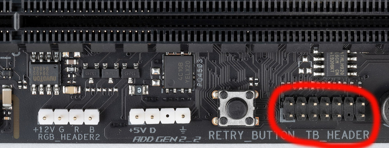 Материнская плата также поддерживает подключение контроллеров Thunderbolt, для чего на ней имеется отдельный разъем.