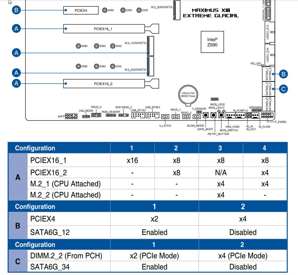 Теперь посмотрим выше на то, как работают процессоры в данной конфигурации. У CPU 11-го поколения всего 20 линий PCIe, 4 из них отведены на порт М.2 (M2_3). У CPU 10-го поколения всего 16 линий (нет выделения линий на М.2 порт). Оставшиеся 16 линий надо делить на два слота PCIe x16 (_1 и _2), а также на два порта М2_1/2_2 (которые также «питаются данными» от процессора). Вариантов переключения несколько: