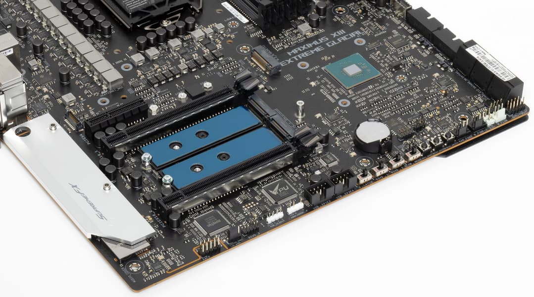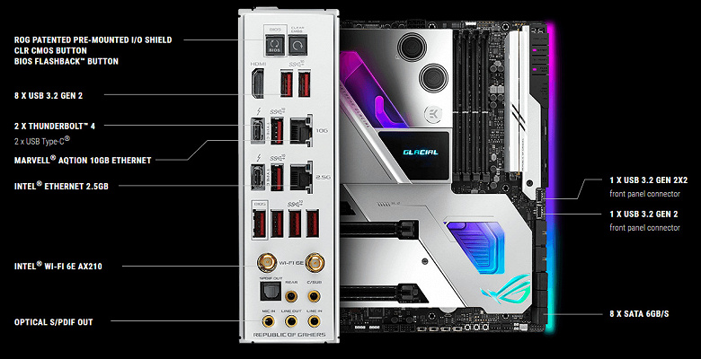 У Asus ROG Maximus XIII Extreme Glacial 20 портов USB разных видов, включая 11 очень быстрых USB 3.2 Gen2, два из которых с поддержкой Thunderbolt 4, а еще есть один самый быстрый USB 3.2 Gen2×2 — правда, в виде внутреннего Type-C, для вывода которого еще придется поискать корпус. Плата предлагает 2 слота PCIe х16 (они получают от процессора 16 линий PCIe, причем версии 4.0 в случае использования процессоров 11-го поколения), 2 слота PCIe x4, аж 5 слотов M.2 (один из них подключен напрямую к процессору линиями PCIe 4.0, еще два также могут подключаться к процессору, но для этого придется уменьшить количество линий PCIe для слотов PCIe x16).