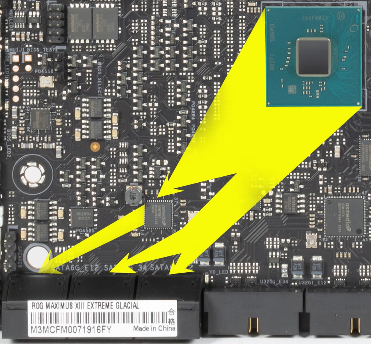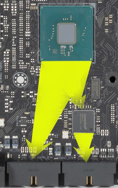 А переключением линий между слотом DIMM.2 и портами SATA занимаются мультиплексоры ASM1480 от ASMedia.