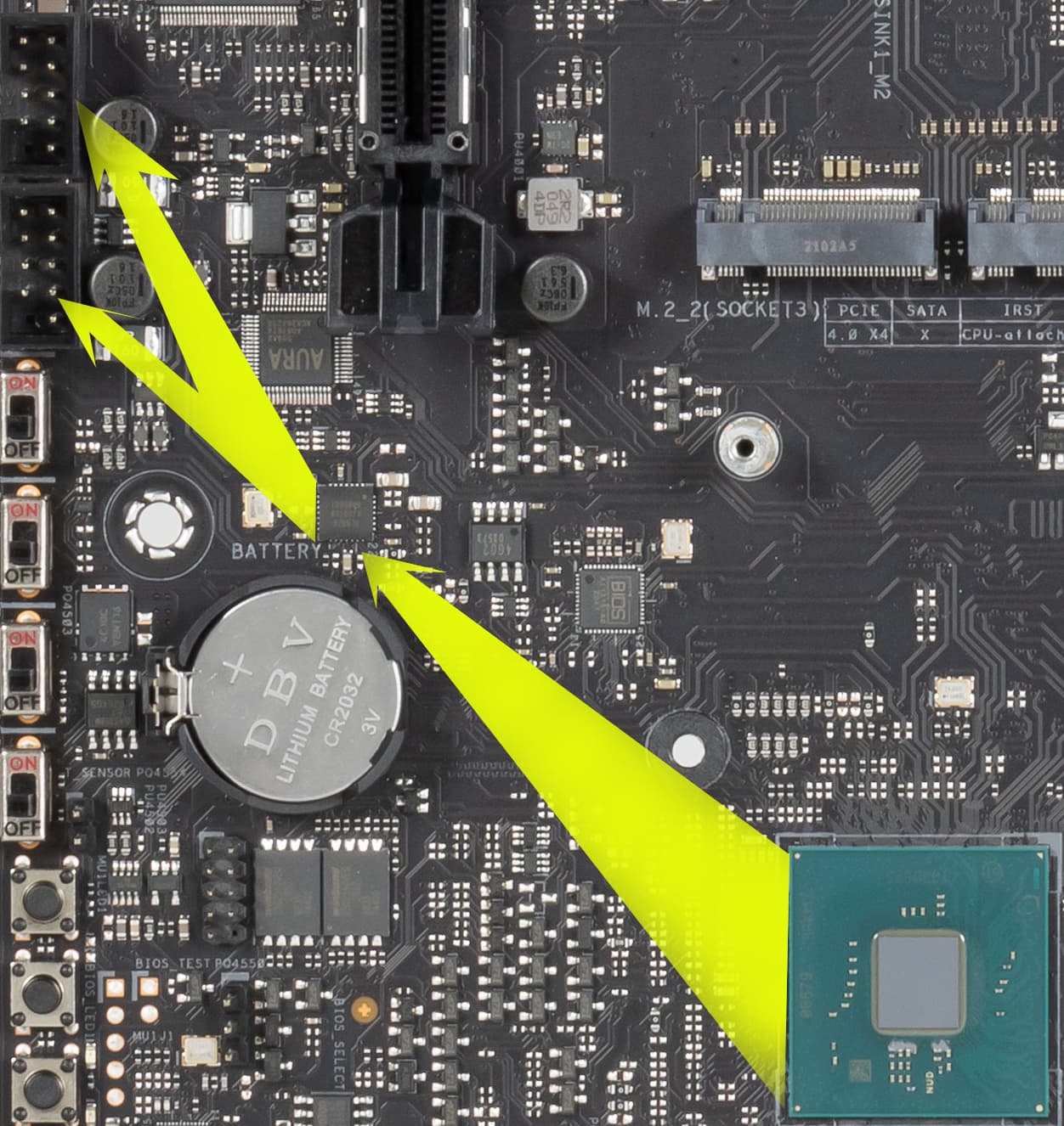 - Переключатель: или порты SATA_3/4 (2 линии) + слот DIMM.2_2 в режиме Х2 (2 линии), или слот DIMM.2_2 в режиме Х4: максимум 4 линии;