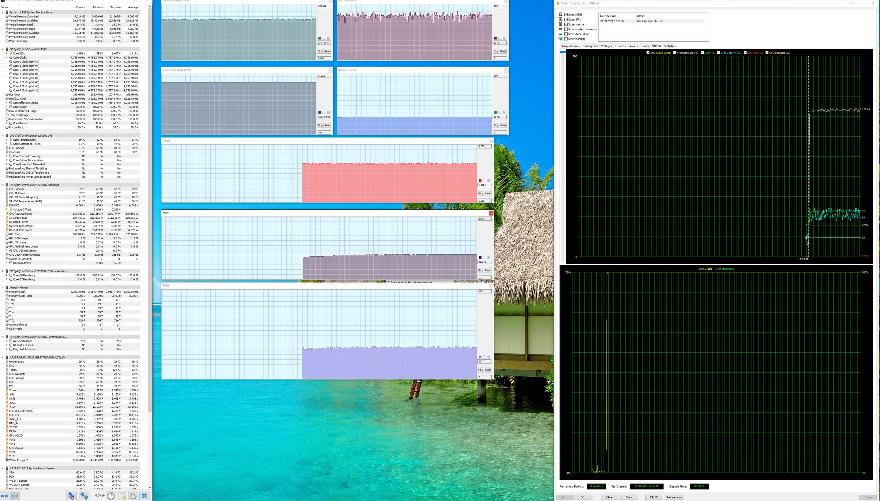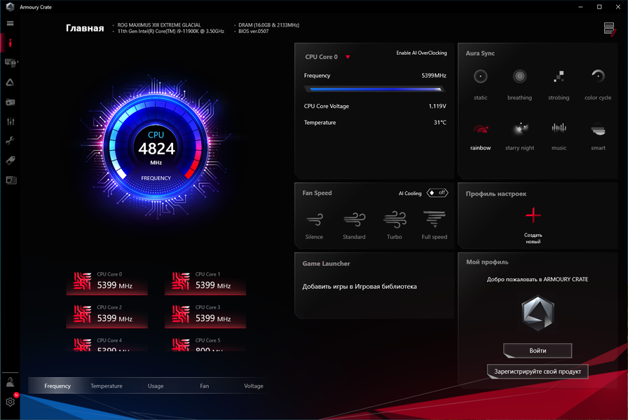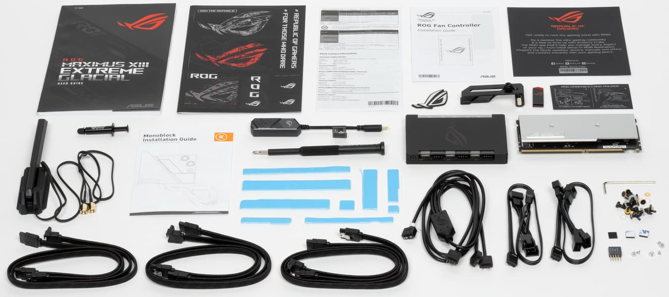 Разумеется, Asus ROG Maximus XIII Extreme Glacial предлагает широкие аппаратные возможности для любителей разгона, а также множество настроек в BIOS Setup и фирменных утилитах — лишь бы СО справлялась (а тут для фанатов кастомных СЖО — просто раздолье!). Обязательно стоит упомянуть и бонусы поставки: кроме ROG Clavis там можно найти дополнительный контроллер для вентиляторов и ARGB-подсветки ROG Fan Controller, а также универсальную раздвижную подпорку под тяжелые видеокарты.