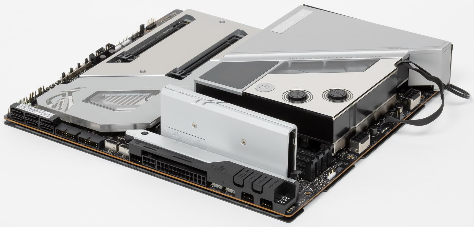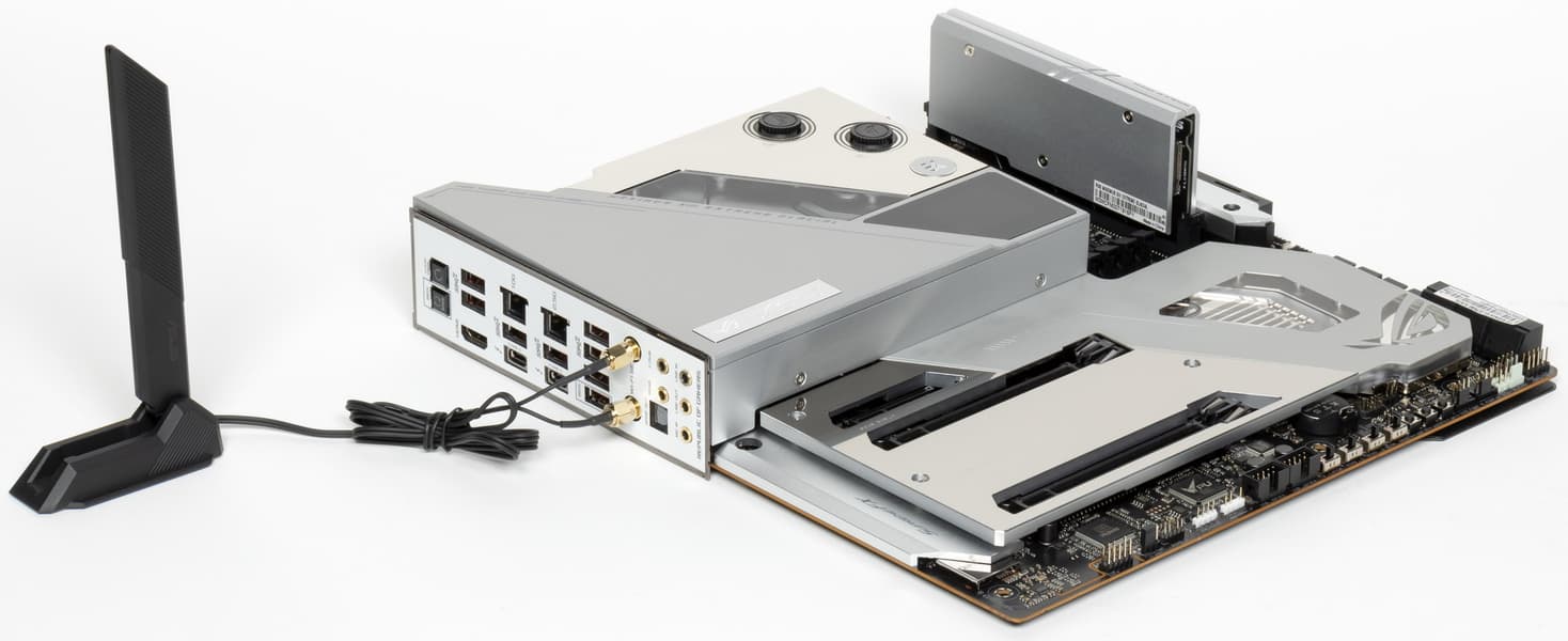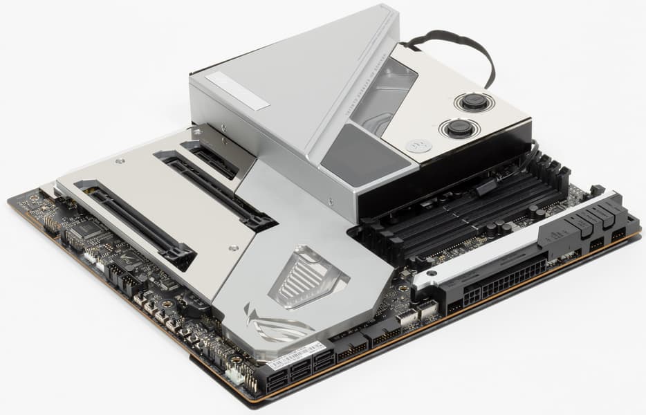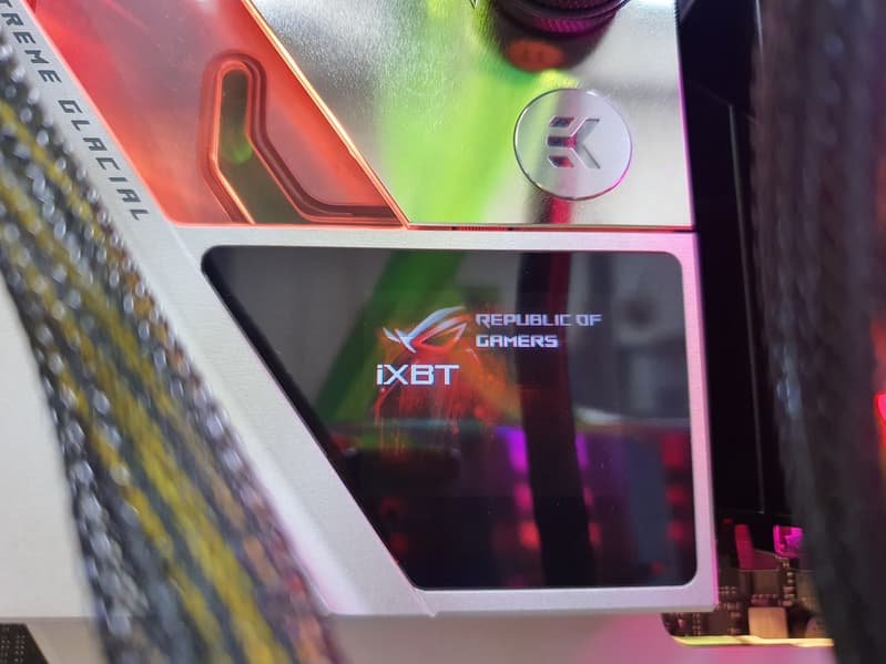 В арсенале платы есть 6 портов SATA и 6 разъемов для вентиляторов (плюс еще 6 разъемов на ROG Fan Controller). Система питания процессора очень мощная, она способна обеспечить работу любых совместимых процессоров с огромным запасом на разгон. Плата имеет грамотную систему охлаждения каждого потенциально греющегося элемента, включая накопители в слотах M.2 (термопрокладки для охлаждения накопителей есть с обеих сторон). Сетевые возможности отличные: два проводных контроллера 2,5 и 10 Гбит/с, а также один самый современный беспроводной. Поддержка Thunderbolt 4 позволяет передавать данные на скорости 40 Гбит/с. В числе плюсов платы можно упомянуть очень эффектную подсветку водоблока, а также широкие возможности для подключения дополнительных RGB-устройств. Отметим прилагаемый в комплекте ROG Clavis — игровой ЦАП, подключаемый к порту USB Type-C и с миниджеком на выходе.