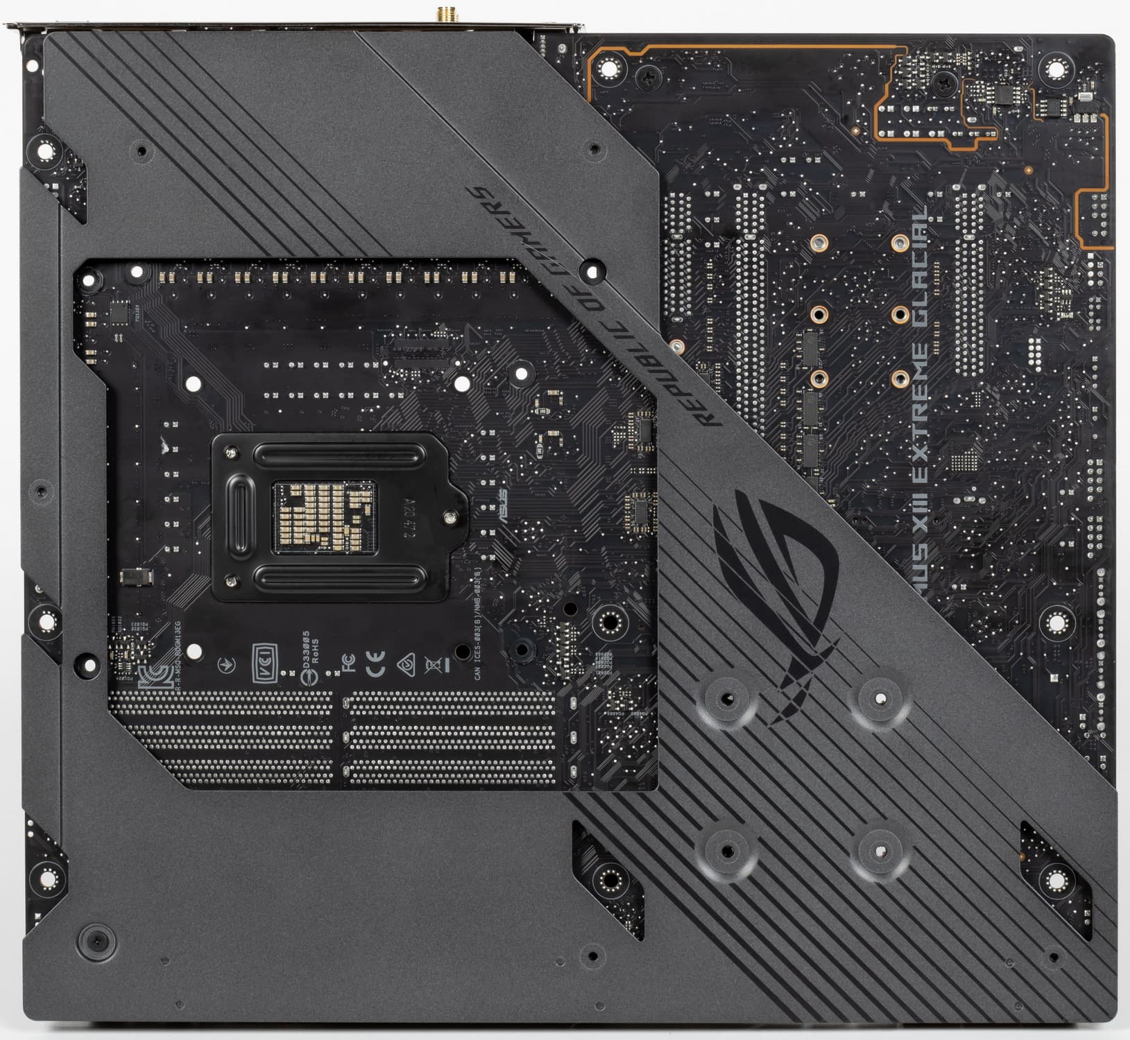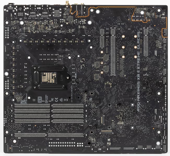 Форм-фактор ATX имеет размеры до 305×244 мм, а E-ATX — до 305×330 мм. Материнская плата Asus ROG Maximus XIII Extreme Glacial имеет размеры 305×277 мм, поэтому выполнена в форм-факторе E-ATX, и на ней имеются 9 монтажных отверстий для установки в корпус. Однако следует иметь в виду, что одно из девяти монтажных отверстий перекрыто водоблоком, поэтому будет невостребовано, ибо монтаж водоблока на плату возможен до установки материнки в корпус.