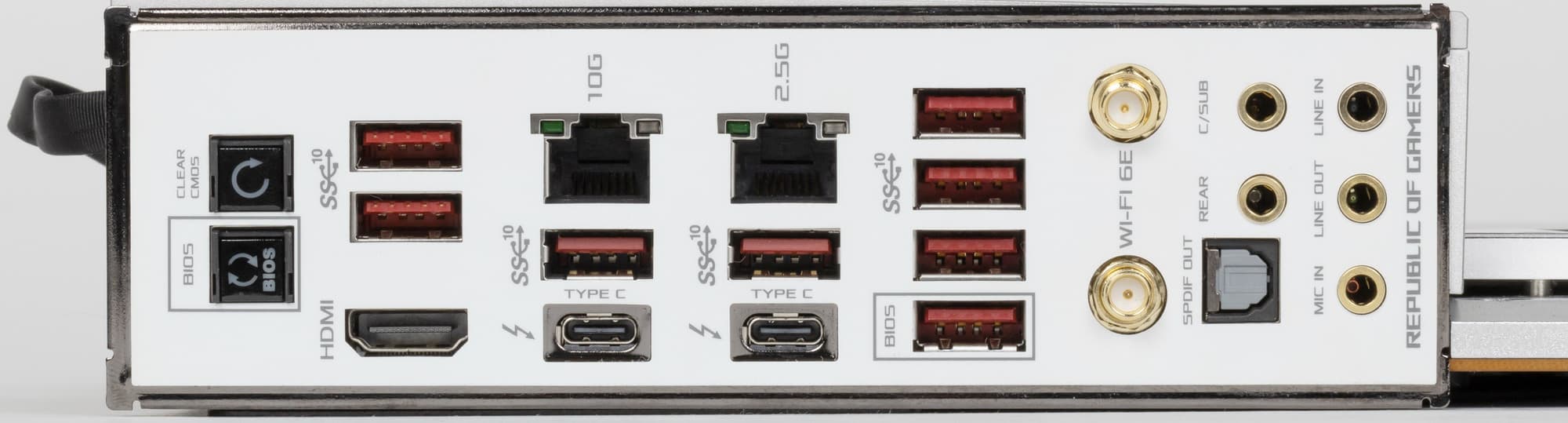 | Разъемы на задней панели | 2 × USB 3.2 Gen2 (Type-C) 8 × USB 3.2 Gen2 (Type-A) 2 × RJ-45 5 аудиоразъемов типа миниджек 1 × S/PDIF (оптический, выход) 1 × HDMI 2.0b 2 антенных разъема кнопка сброса CMOS кнопка перепрошивки BIOS — Flashback |