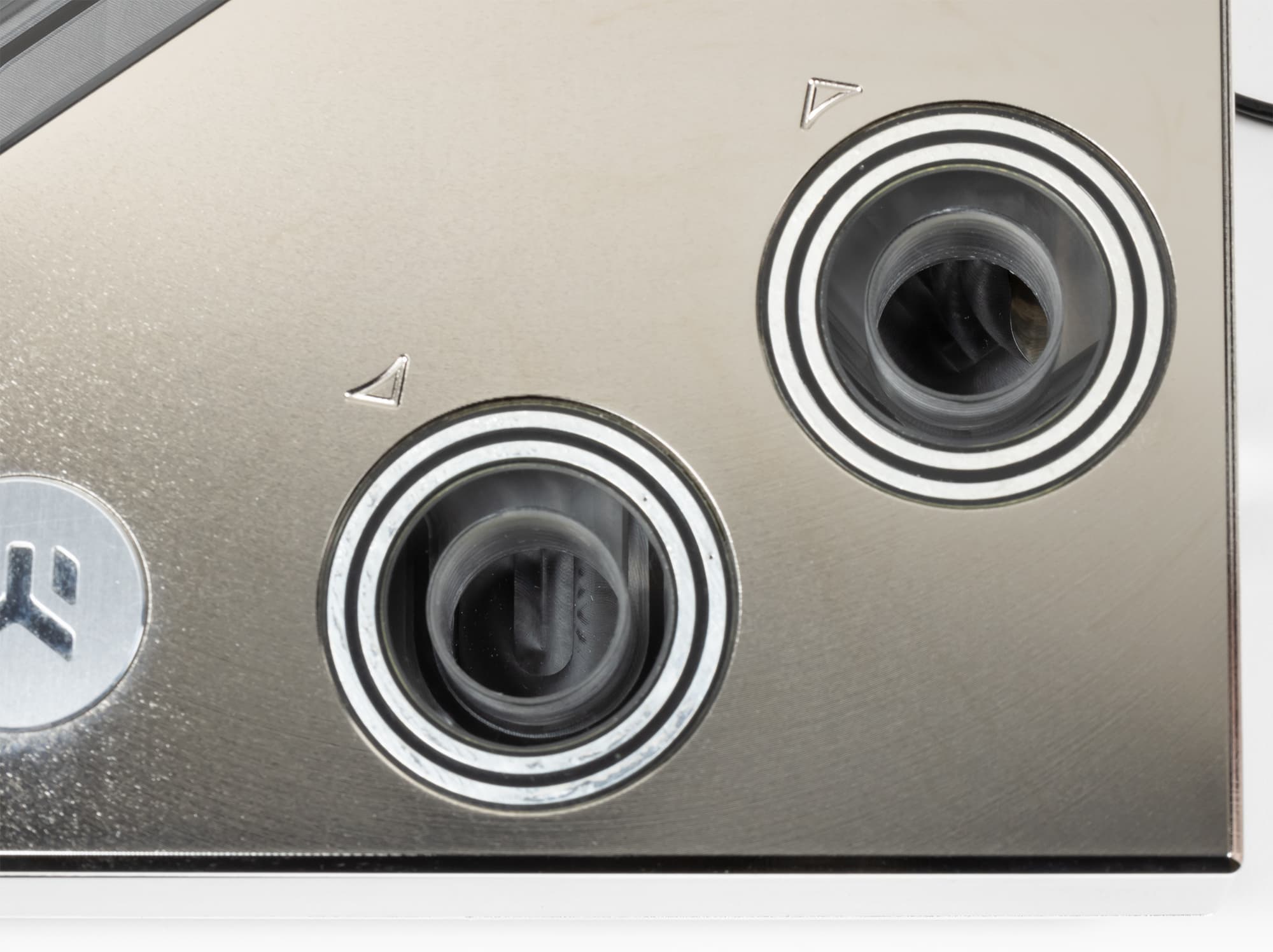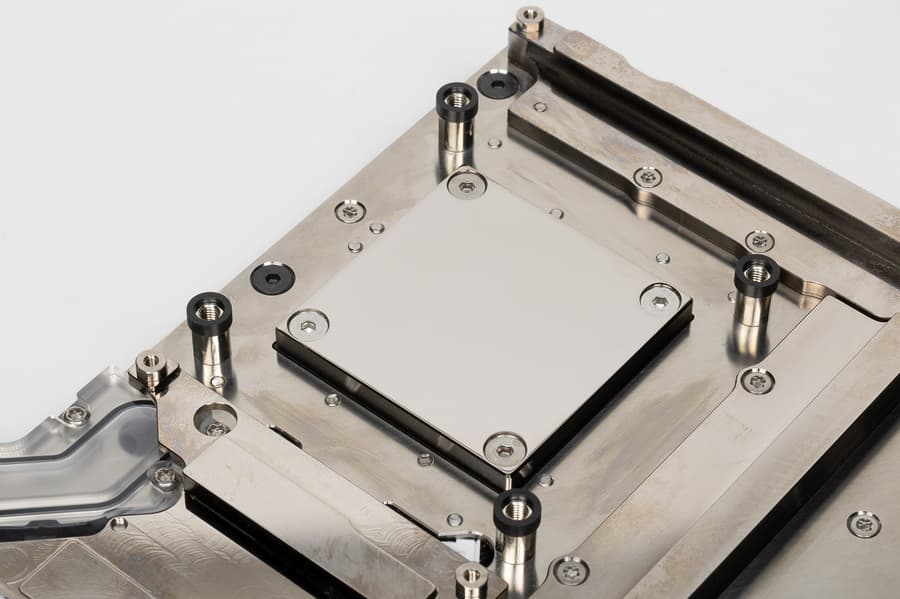 Соприкасающиеся с кристаллами поверхности тщательно отшлифованы. Сам водоблок — из медного сплава и покрыт никелем. Отверстия для монтажа трубок кастомной СЖО находятся в верхней части блока, расстояние между ними достаточно для того, чтобы установить даже весьма широкие фиттинги. Мы помним, что в комплект поставки входит фирменный набор фиттингов от ЕК (которая и изготовила, собственно, данный водоблок).