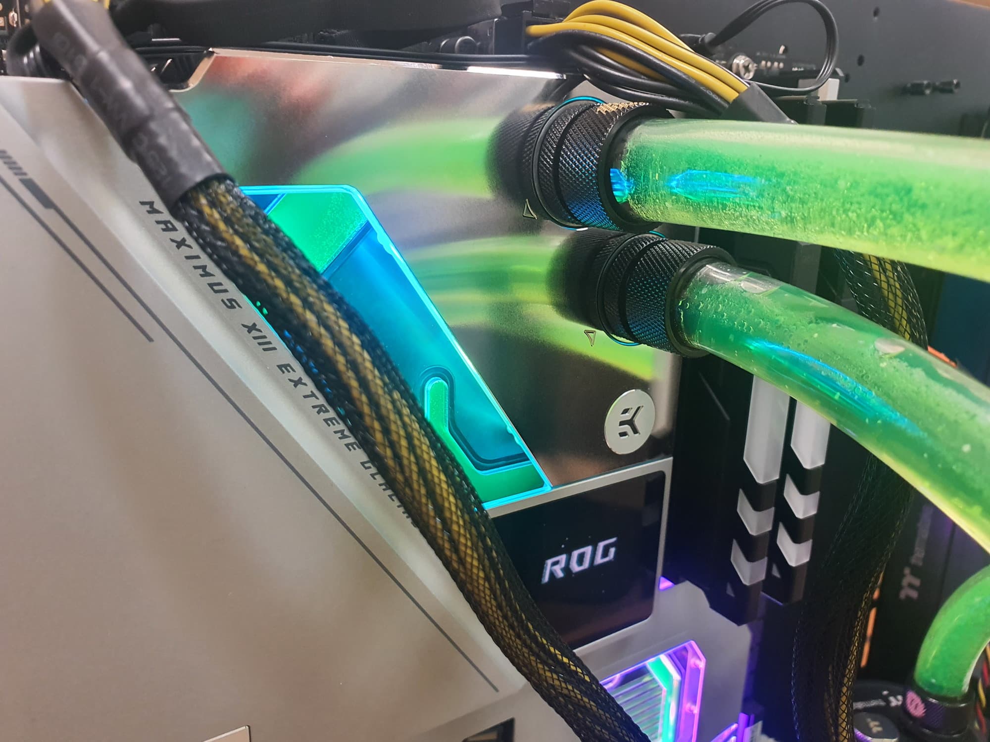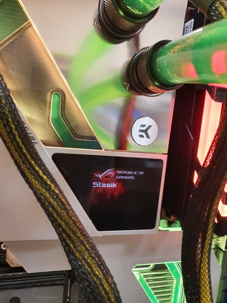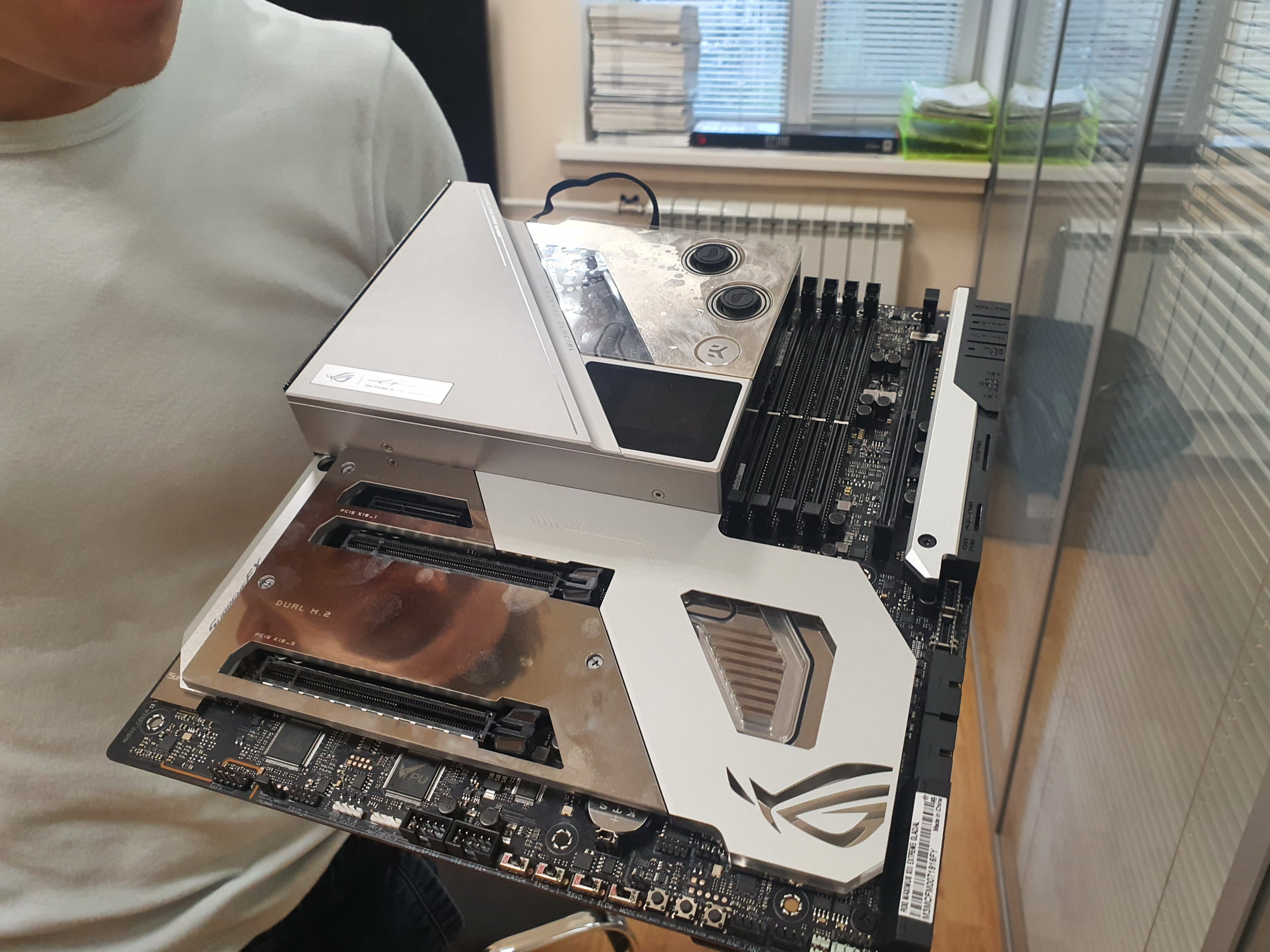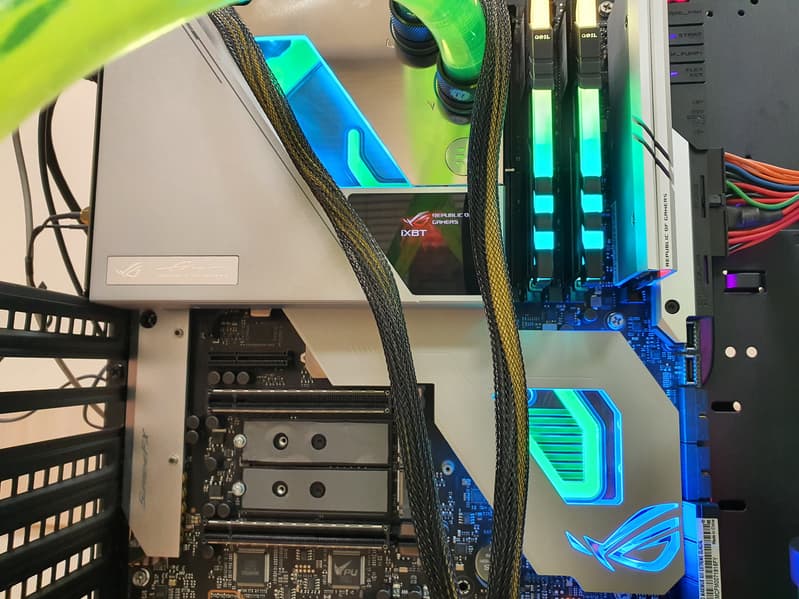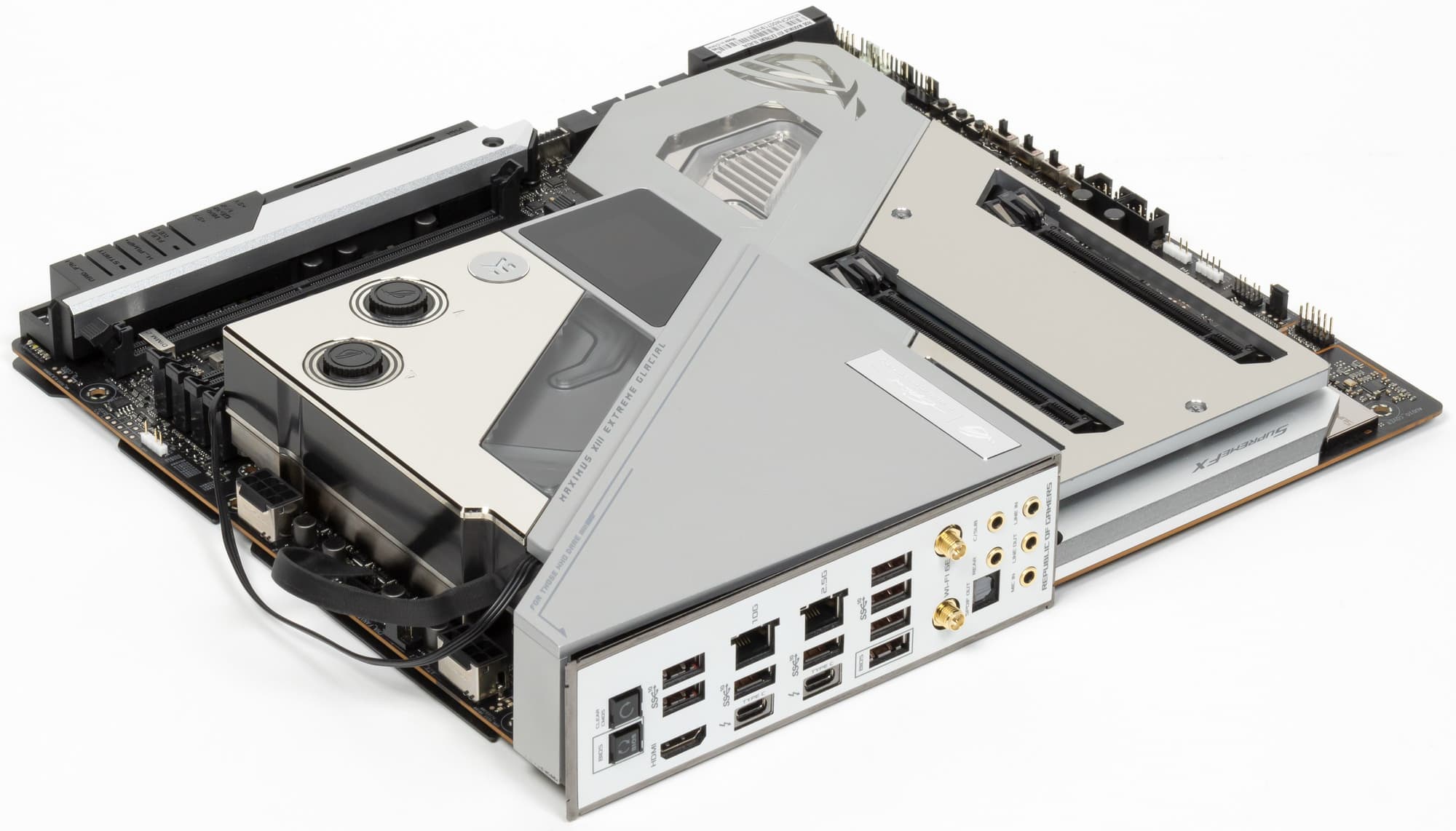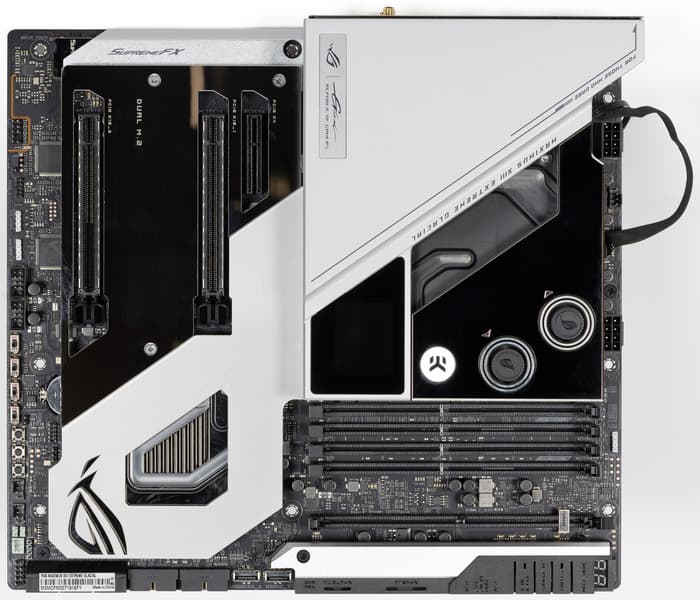Самое интересное в этом обзоре — это как раз сама материнская плата, а не свойства чипсета или иной периферии. Вернее сказать даже не просто матплата, а водоблок, покрывающий по сути ее. Да, перед нами самый навороченный флагманский продукт, относящийся к топовому суббренду ROG, требующий наличия кастомной системы жидкостного охлаждения — Asus ROG Maximus XIII Extreme Glacial.