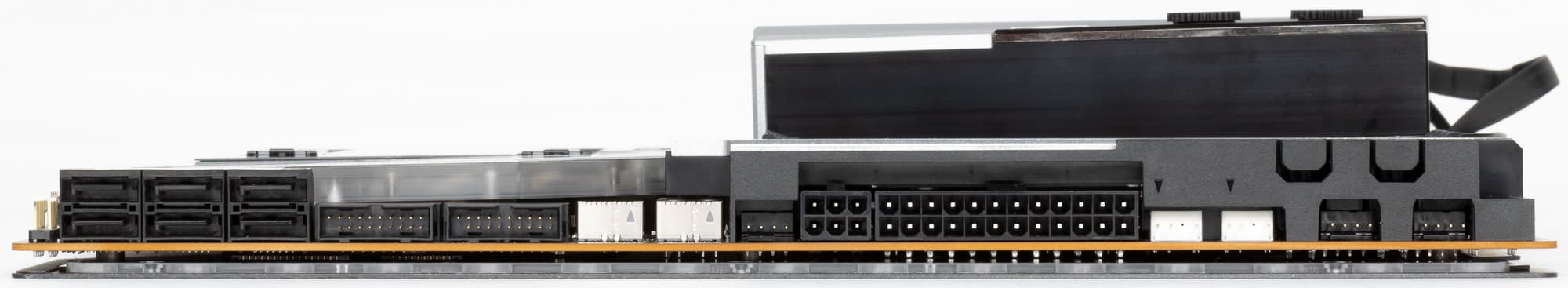 На оборотной стороне расположена некоторая логика. Текстолит обработан хорошо: во всех точках пайки не только острые концы срезаны, но и все неплохо отшлифовано. На задней стороне установлена пластина из алюминия с наноуглеродным покрытием. Она пластина помогает отводить тепло от задней стороны PCB через термоинтерфейс и обеспечивает жесткость материнской платы. И я еще раз заострю внимание на том, что такую матплату вряд ли получится установить в корпусе, где в качестве опор для материнских плат используются не привычные всем латунные втулки, а выпрессованные возвышения, которые (по опыту) много шире, нежели выемки в задней пластине у материнки.
