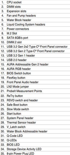 | Прочие внутренние элементы | 24-контактный разъем питания ATX 2 8-контактный разъем питания EPS12V 1 6-контактный разъем питания PCIe12V 1 слот M.2 (E-key), занят адаптером беспроводных сетей 1 разъем для подключения порта USB 3.2 Gen2x2 Type-C 1 разъем для подключения порта USB 3.2 Gen2 Type-C 2 разъема для подключения 4 портов USB 3.2 Gen1 2 разъема для подключения 4 портов USB 2.0 8 разъемов для подключения 4-контактных вентиляторов и помп ЖСО 1 разъем для подключения неадресуемой RGB-ленты 3 разъема для подключения адресуемой ARGB-ленты 1 разъем аудио для передней панели корпуса 1 разъем для сброса CMOS 1 кнопка OC Retry 1 кнопка Safe Boot 1 переключатель Slow Mode 1 переключатель V_Latch 1 разъем для термодатчикa 3 разъема подключения фирменных помп СВО Asus 2 разъема для подключения управления с передней панели корпуса 1 кнопка включения питания Power 1 кнопка перезагрузки Reset |