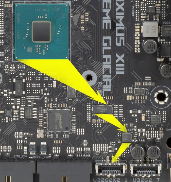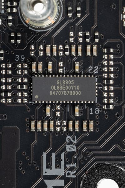 - 1 порт USB 3.2 Gen2x2: реализован с помощью Z590 (на это ушел 1 USB 3.2 Gen2) и двух «помощников»: хаба ITE IT8851 (который образует USB 3.2 Gen1) и усилителя Genesys Logic GL9905 (который преобразует сие в USB 3.2 Gen2) и представлен внутренним портом Type-C (для подключения к соответствующему разъему на передней панели корпуса);