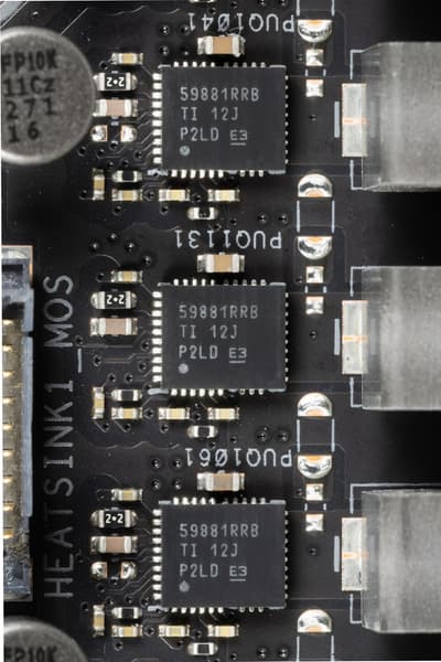 Каждый канал фазы имеет суперферритовый дроссель и 59881RRB MOSFET от Texas Instruments на 100 А.