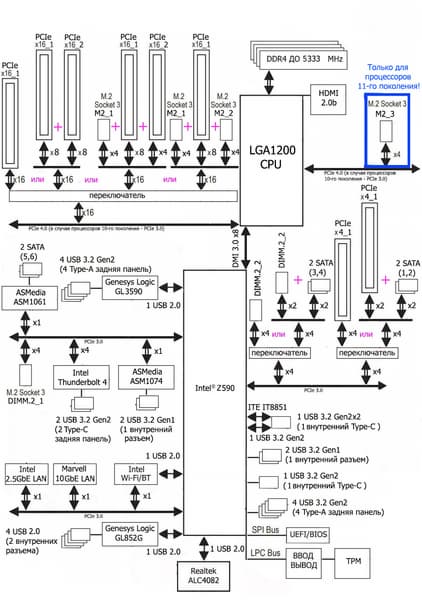 Процессоры Intel Core 11-го поколения (совместимые с сокетом LGA1200 и поддерживаемые Z590) имеют 20 линий ввода-вывода PCIe 4.0, не имеют USB и SATA портов. При этом взаимодействие с Z590 идет по особому каналу Digital Media Interface 3.0 (DMI 3.0), который в Z590 ускорен в 2 раза. Все PCIe линии процессора идут на слоты расширения PCIe и порт М.2. Serial Peripheral Interface (SPI) используется для взаимодействия с системой UEFI/BIOS, а шина Low Pin Count (LPC) — для связи с устройствами ввода/вывода, не требующими высокой пропускной способности (контроллерами вентиляторов, TPM, старой периферии). Процессоры Intel Core 10-го поколения (совместимые с сокетом LGA1200 и поддерживаемые Z490/590) имеют 16 линий ввода-вывода PCIe 3.0, которые идут только на слоты расширения PCIe.