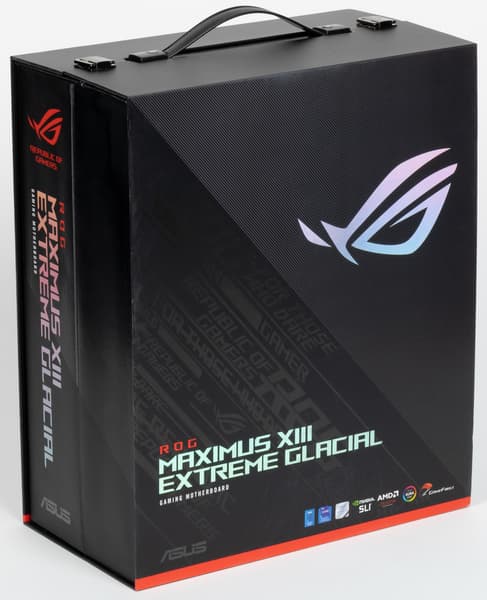 Asus ROG Maximus XIII Extreme Glacial поставляется в огромном кейсе, который имеет ручку для переноски и раскладывается пополам. В одной половине — сама матплата, тщательно уложенная в толстый слой мягкого материала, во второй — водоблок в своем отсеке, ну и остальной комплект.