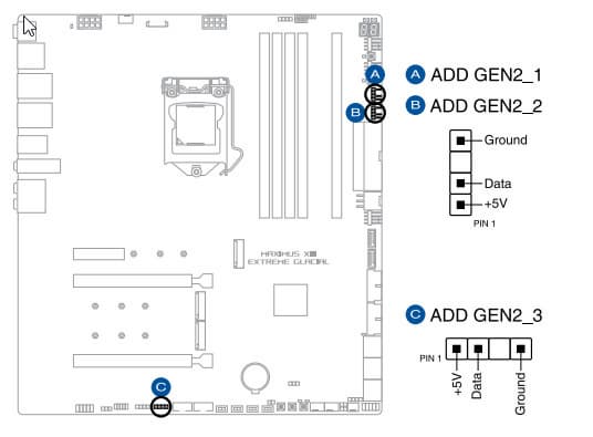 Теперь про блок ввода-вывода, разъемы для подключения вентиляторов и т. п. Разъемов для подключения вентиляторов и помп на самой плате — 6. Схема размещения коннекторов для систем охлаждения выглядит так:
