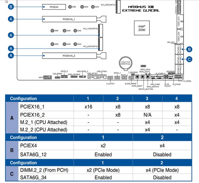 Теперь в целом про слоты PCIe. Всего на плате есть 3 слота: два PCIe x16 (для видеокарт или других устройств) и один PCIe x4. Если про первые два PCIe x16 (второй и третий по общему счету) я выше уже рассказал (они подключены к CPU), то PCIe x4 (первый по общему счету) подключен к Z590, и он рассчитан на режим только х4, однако делит ресурсы с портами SATA_1/2 весьма хитрым способом: в случае использования PCIe x4 в режиме х4, порты SATA_1/2 работать не будут, а если нужны эти порты, то придется PCIe x4 перевести в режим х2.