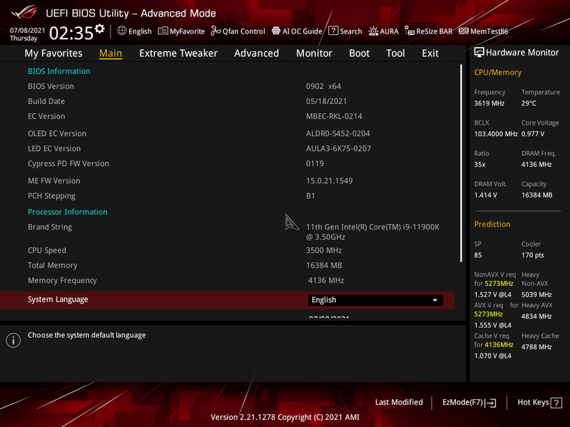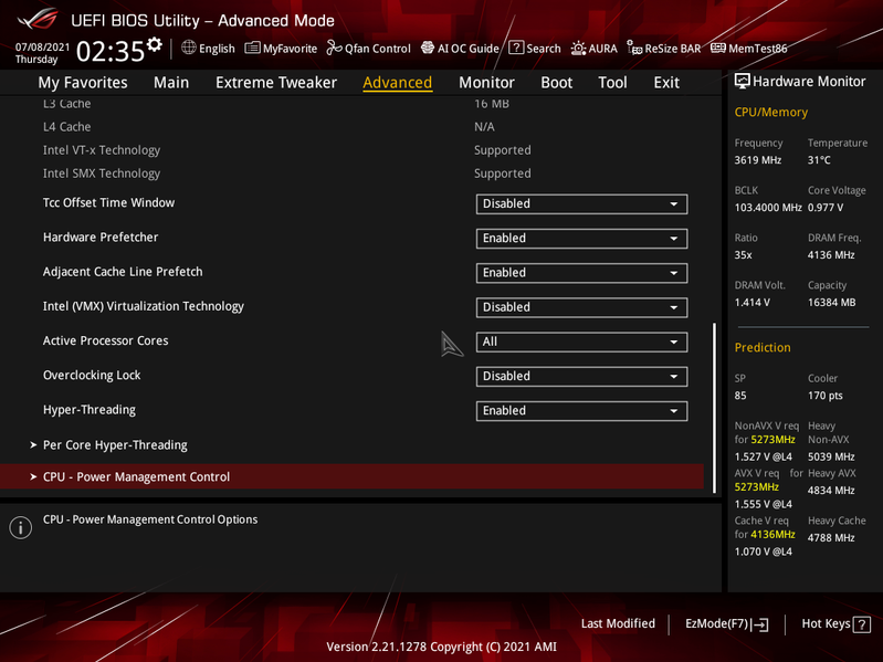 Еще при изучении настроек в BIOS можно найти некий предустановленный режим работы Asus Optimized, то есть система сама определит по питанию и возможностям охлаждения максимально возможные частоты работы. При ее выборе изначально выставляется 5.2 ГГц по всем ядрам, однако уже нет четкой синхронизации частот между ядрами. Разумеется при запуске стресс-тестов нагрев процессора моментально достиг почти критических отметок в 98 градусов, однако троттлинг допущен не был, система сама стала понижать частоты по ядрам (разбег от 4,2 до 5,1 ГГц), балансируя на максимуме возможного нагрева в 90-93 градуса. В целом оказалось, что производительность в этом режиме на пару процентов выше (в среднем) чем в предыдущем, ну кроме разве что Adobe Premiere, где производительность в Asus Optimized выше на 3.2% чем в режиме по умолчанию.