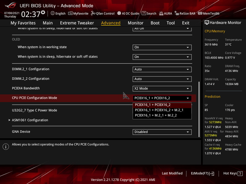 - Слот PCIe x16_1 имеет 8 линий, слот PCIe x16_2 имеет 4 линии, порт М2_1 имеет 4 линии, порт М2_2 отключен;