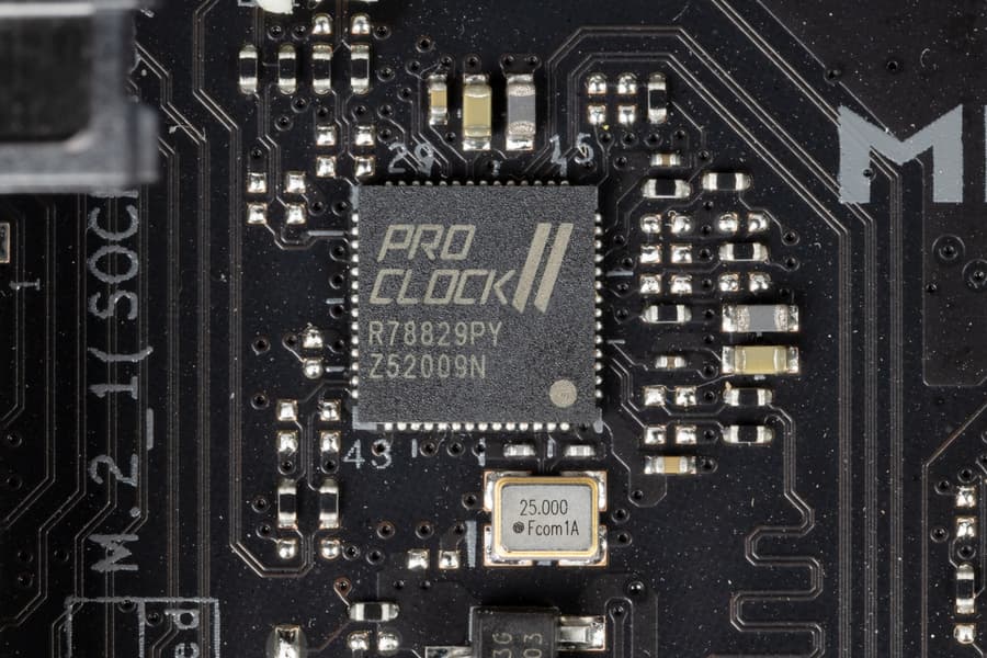 Для поддержания стабильных частот на шине PCIe (и для нужд оверклокеров) имеется внешний тактовый генератор неизвестного производителя, промаркированный Asus как ProClock II.