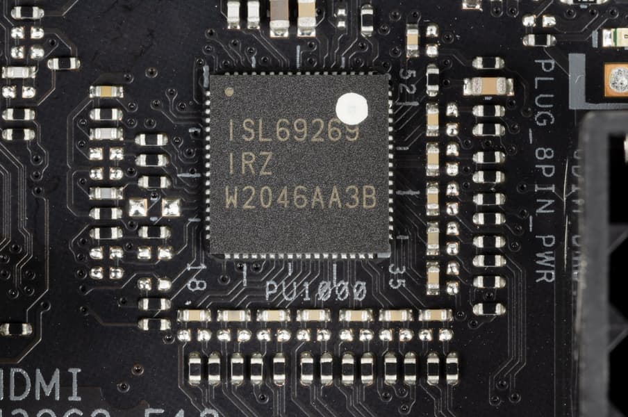 Управляет схемой ШИМ-контроллер ISL69269 от Renesas (ex Intersil), рассчитанный максимум на 8-12 фаз (зависит от модификации).