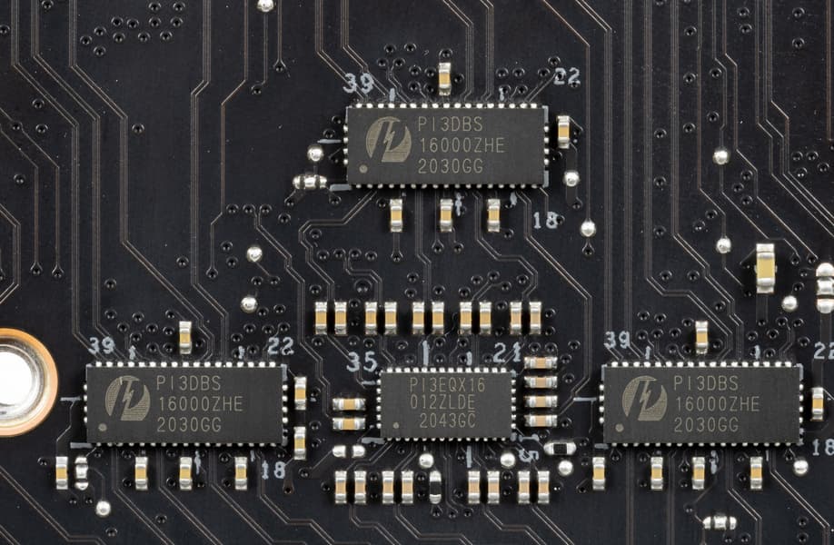 Как видим, перераспределение линий PCIe между слотами у этой материнки имеется, поэтому востребованы мультиплексоры от Diodes Inc. (ex Pericom).