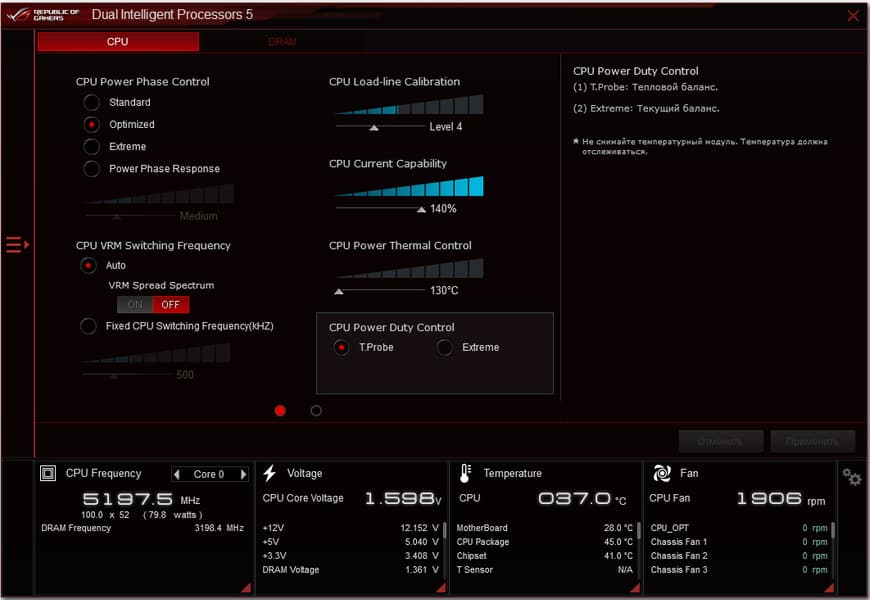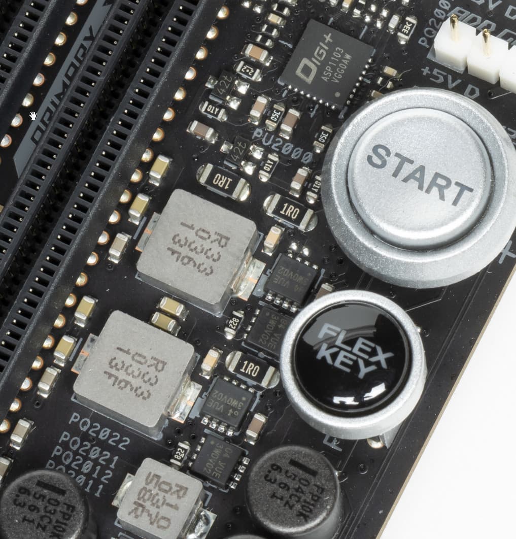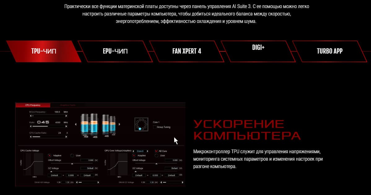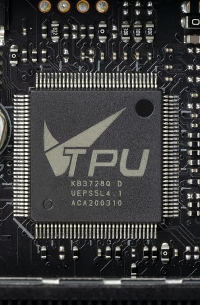 Хорошо известно, что инженеры Asus никогда не пользуются удвоителями фаз для управления огромным их количеством, ведь ШИМ-контроллеры в большинстве своем умеют работать с 8-ю (реже с 12) фазами. Практически на всех материнских платах среднего и топового уровней можно найти фирменный цифровой контроллер TPU, который как раз и занимается умными сборками фаз питания для ШИМ-контроллера. В частности тут имеем:
