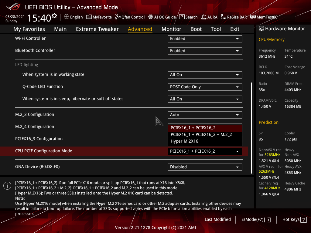 Надо особо отметить, что в случае установки видеокарты в PCIe x16_2 при пустом PCIe x16_1, оба они все равно получают по 8 линий (порт М2_2 отключен).
