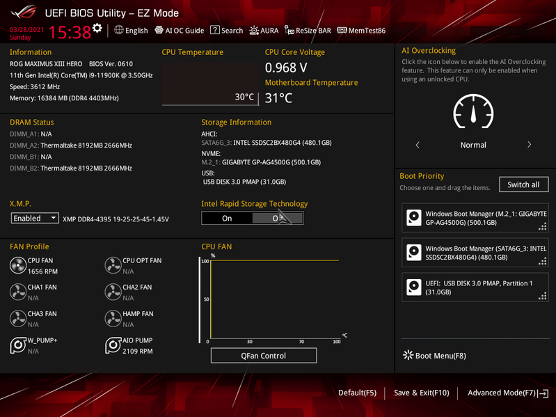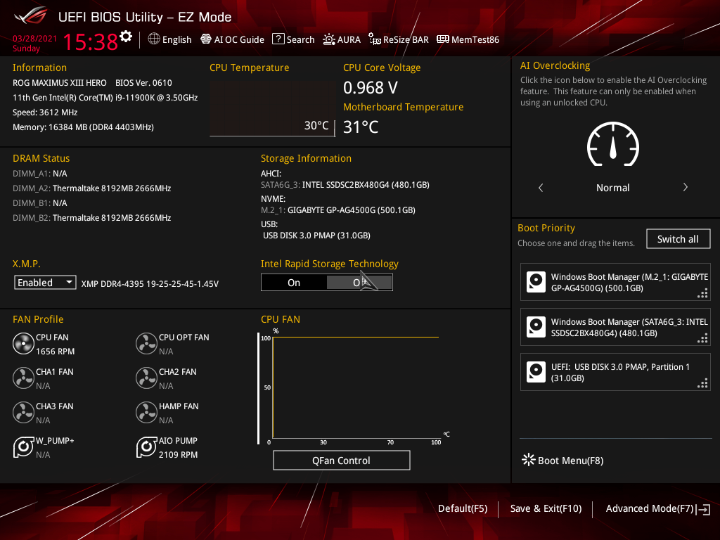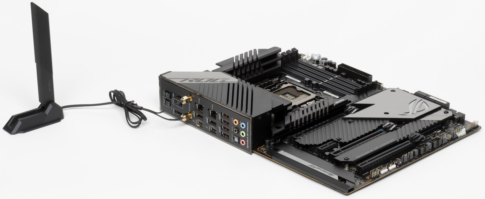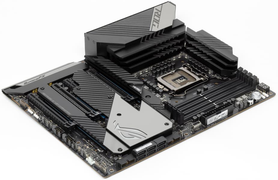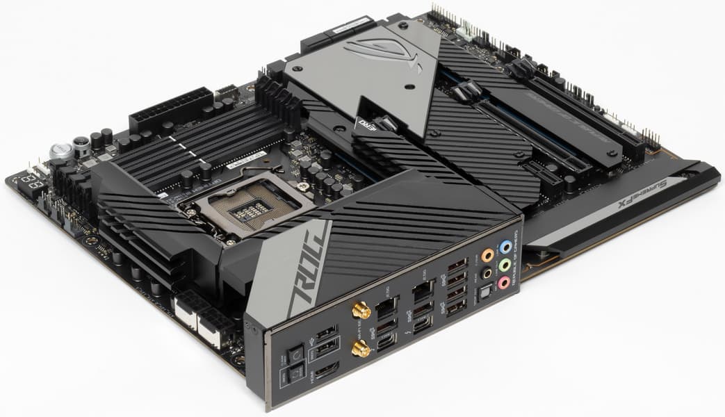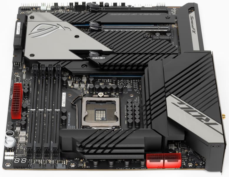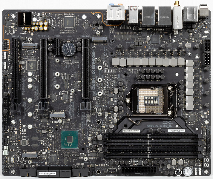 У Asus ROG Maximus XIII Hero имеется 19 портов USB разных видов, включая 8 очень быстрых USB 3.2 Gen2, из которых два поддерживают Thunderbolt 4, а также один самый быстрый USB 3.2 Gen2×2, правда в виде внутреннего Type-C, для вывода которого еще придется поискать корпус. Плата также предоставляет 3 слота PCIe х16 (два из которых получают от процессора 16 линий PCIe, причем версии 4.0 в случае использования процессоров 11-го поколения), 1 слот PCIe x1, аж 4(!) слота M.2 (один из них подключен напрямую к процессору линиями PCIe 4.0, еще один также может подключаться к процессору, но для этого придется уменьшить количество линий PCIe для слотов PCIe x16).