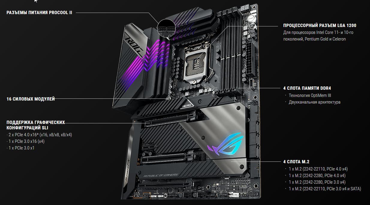Asus ROG Maximus XIII Hero — представитель топовой серии ROG, но сравнительно компромиссный, со стоимостью в районе 40 тысяч рублей. Это весьма навороченная материнская плата с поддержкой 11-го поколения процессоров Intel, созданная для хардкорных геймеров и энтузиастов-оверклокеров.