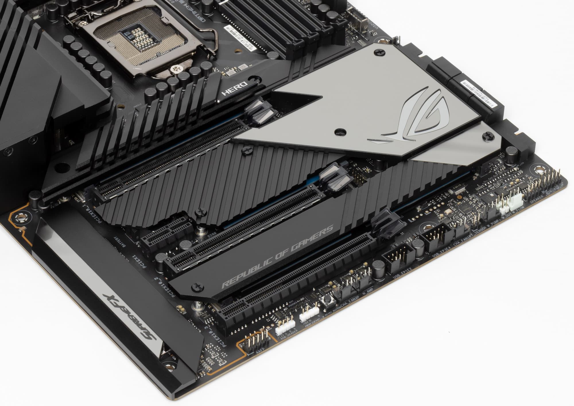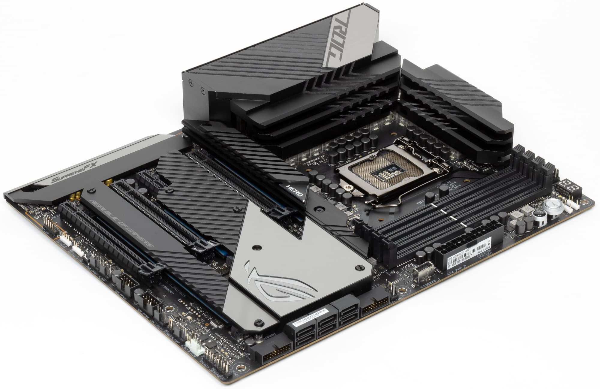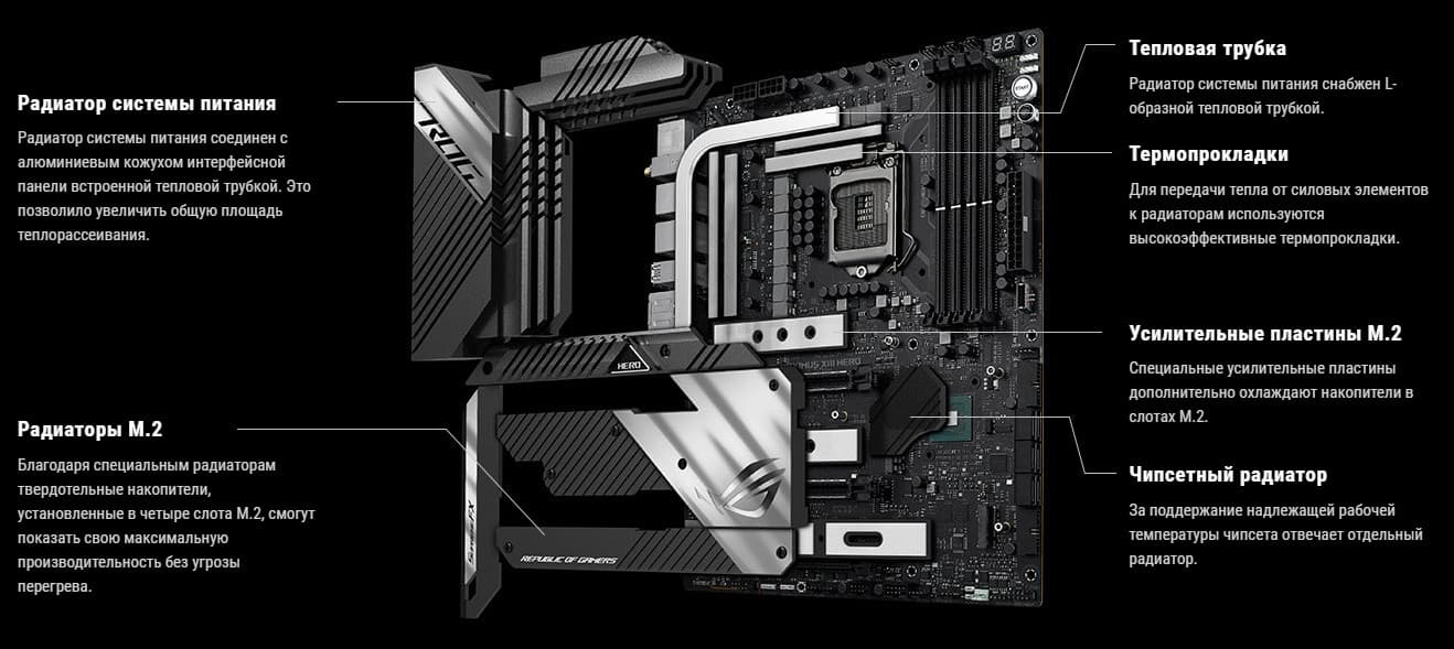 Возвращаюсь к самой материнской плате, которая относится к топовому суббренду ROG, поэтому перед нами почти флагман (мы помним, что самая-самая в этой линейке — материнка c суффиксом Extreme, а Hero — на ступень ниже).