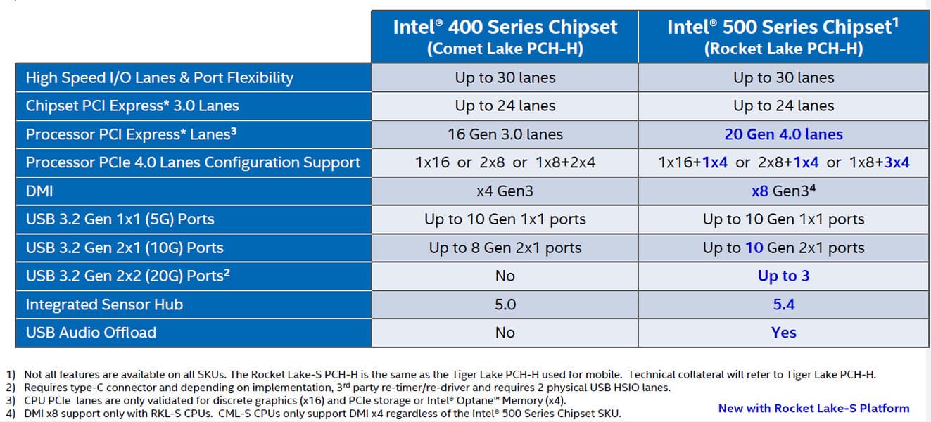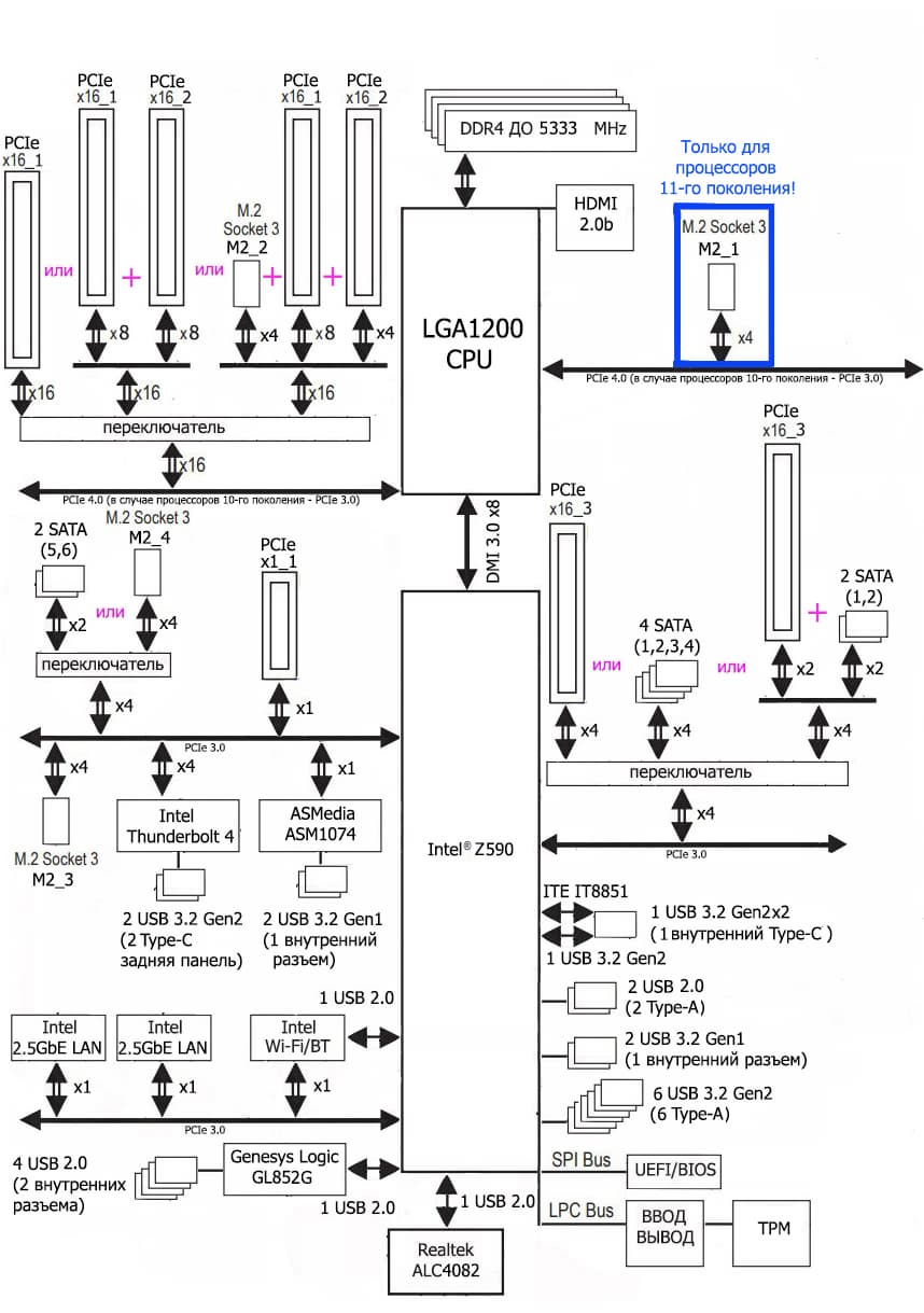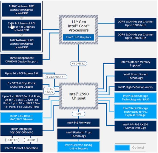Процессоры Intel Core 11-го поколения (совместимые с сокетом LGA1200 и поддерживаемые Z590) имеют 20 линий ввода-вывода PCIe 4.0, не имеют USB и SATA портов. При этом взаимодействие с Z590 идет по особому каналу Digital Media Interface 3.0 (DMI 3.0), который в Z590 ускорен в 2 раза. Все PCIe линии процессора идут на слоты расширения PCIe и порт М.2. Serial Peripheral Interface (SPI) используется для взаимодействия с системой UEFI/BIOS, а шина Low Pin Count (LPC) — для связи с устройствами ввода/вывода, не требующими высокой пропускной способности (контроллерами вентиляторов, TPM, старой периферии). Процессоры Intel Core 10-го поколения (совместимые с сокетом LGA1200 и поддерживаемые Z490/590) имеют 16 линий ввода-вывода PCIe 3.0, которые идут только на слоты расширения PCIe.