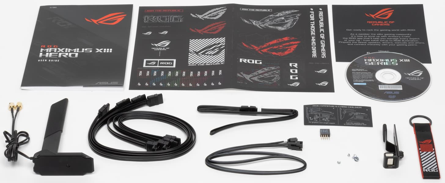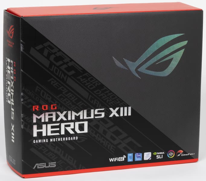 Asus ROG Maximus XIII Hero поставляется в традиционной толстой черно-красной коробке фирменного дизайна серии ROG. Комплект размещен под платой в отдельном отсеке.