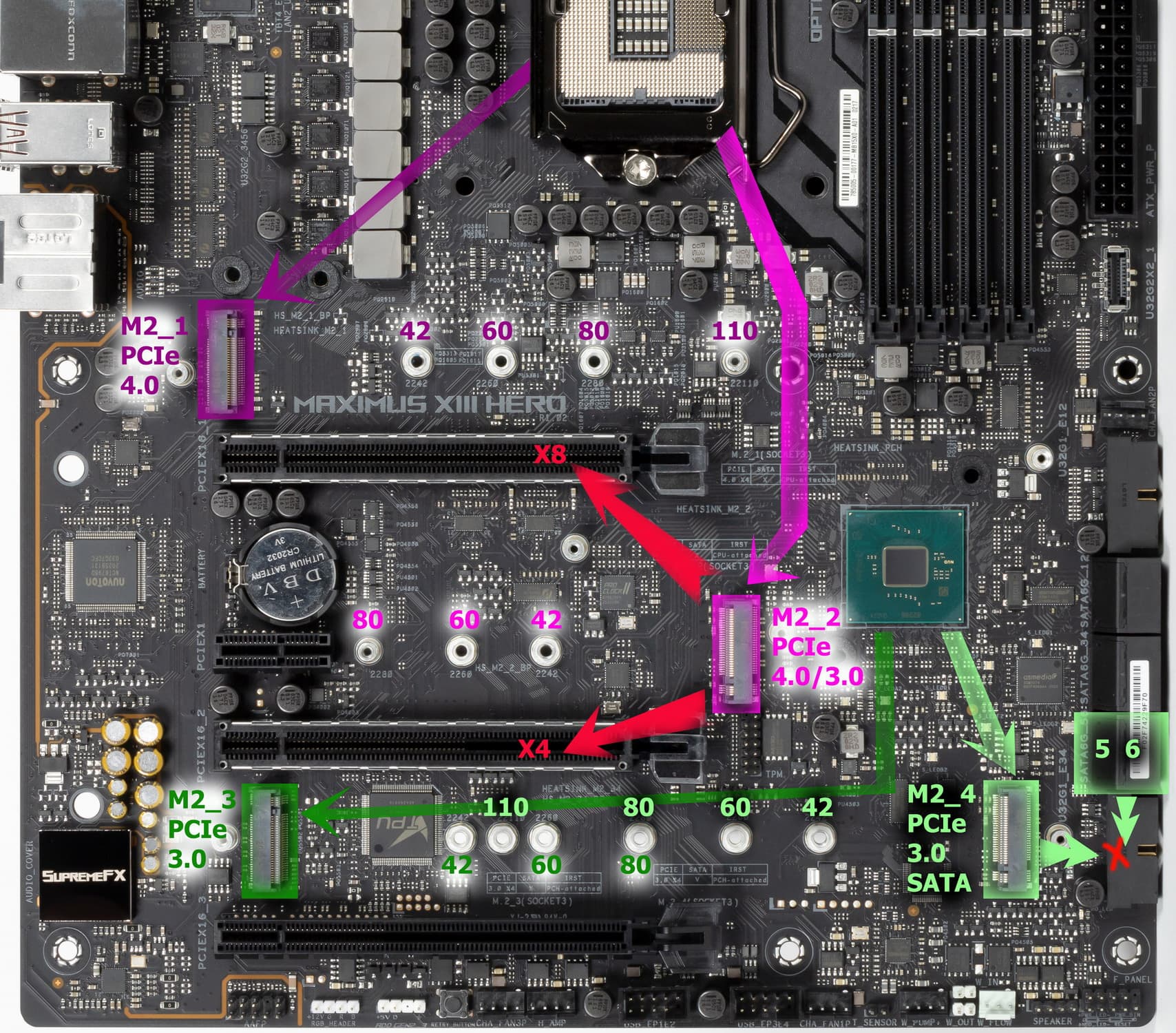 Поскольку количество HSIO линий у Z590 ограничено тридцатью, то приходится делить ресурсы, о чем я выше уже говорил, рассматривая PCIe слоты. Поэтому слот M2_4 не может работать вместе с SATA_5/6 (и мы помним про всякие заморочки с SATA_1/2/3/4 вместе со слотом PCIe x16_3). Только М2_3 ни с чем ресурсы не делит.
