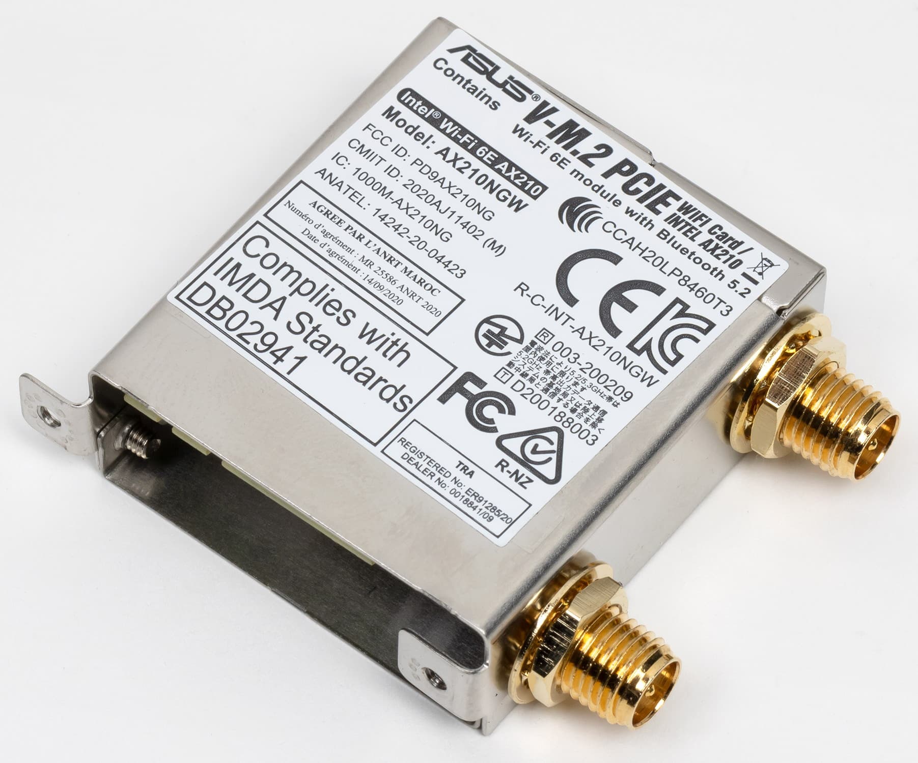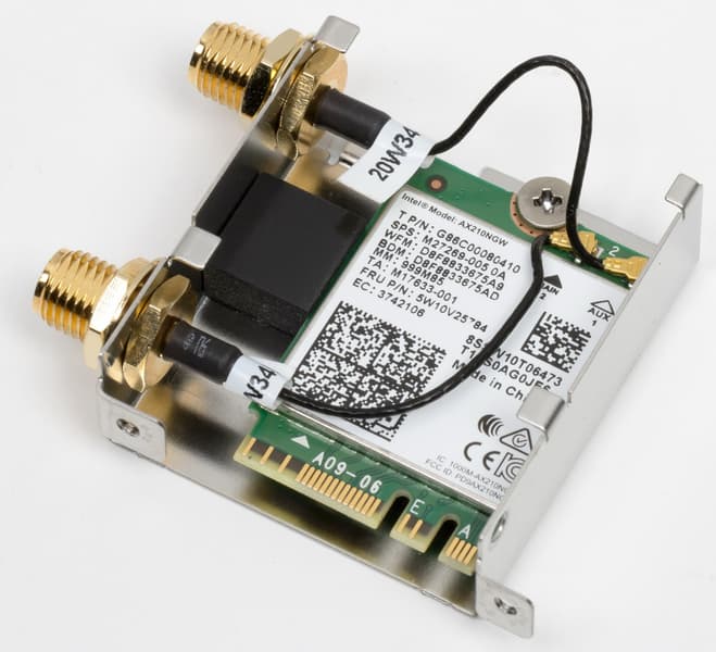 Имеется и комплексный беспроводной адаптер на контроллере Intel AX-210NGW, через который реализованы Wi-Fi 6E (802.11a/b/g/n/ac/ax) и Bluetooth 5.2. Он установлен в слот M.2 (E-key), и его разъемы для привинчивания выносных антенн выведены на заднюю панель.