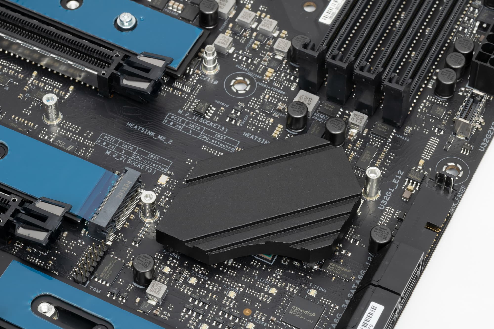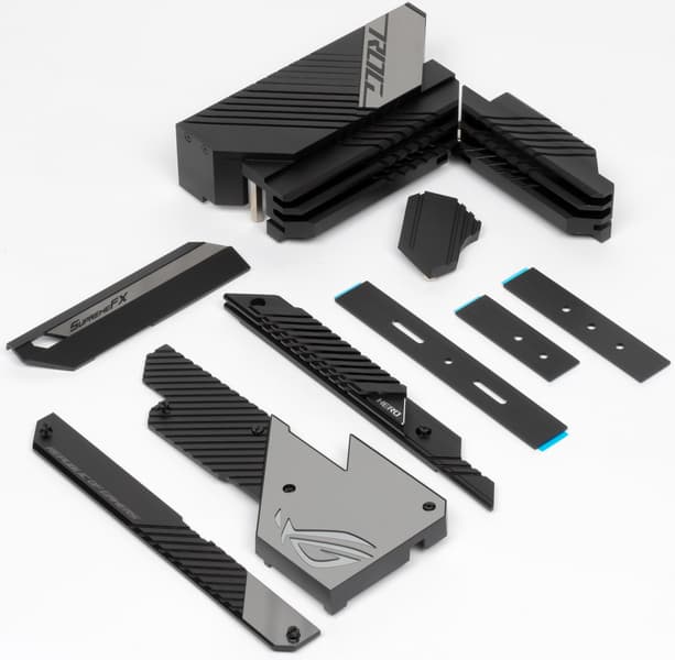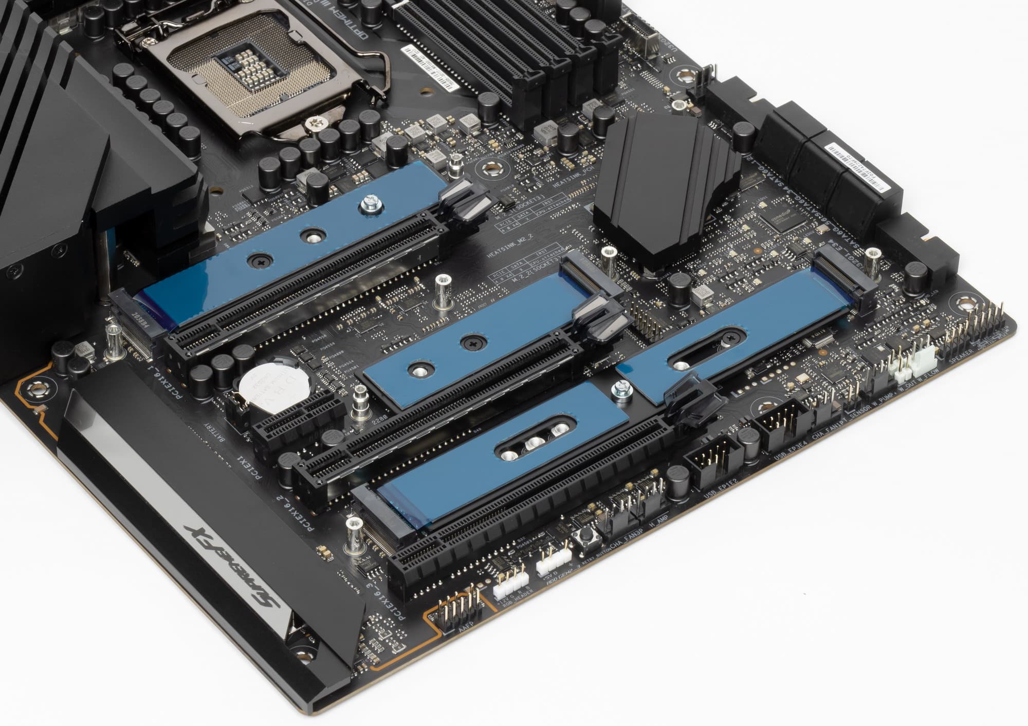 Как я уже упоминал ранее, M.2 слоты также имеют радиаторы: у верхнего и среднего — свои персональные радиаторы, у двух нижних — общий.