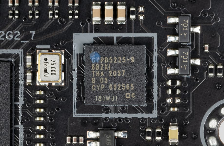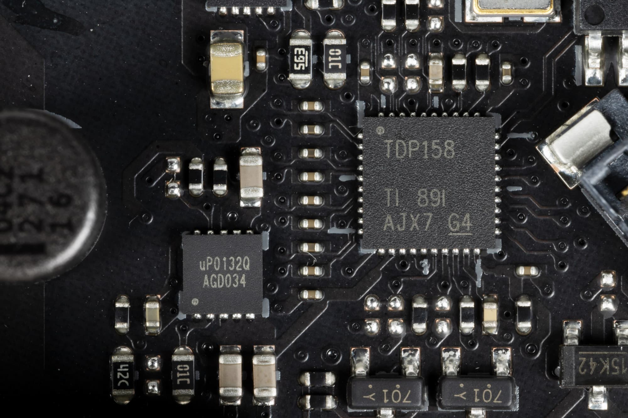 Все быстрые USB порты Type-C оснащены ре-драйверами PI3EQX от Diodes Inc (ex Pericom), дающими устойчивый вольтаж, способный обеспечить быструю зарядку мобильных гаджетов через них.