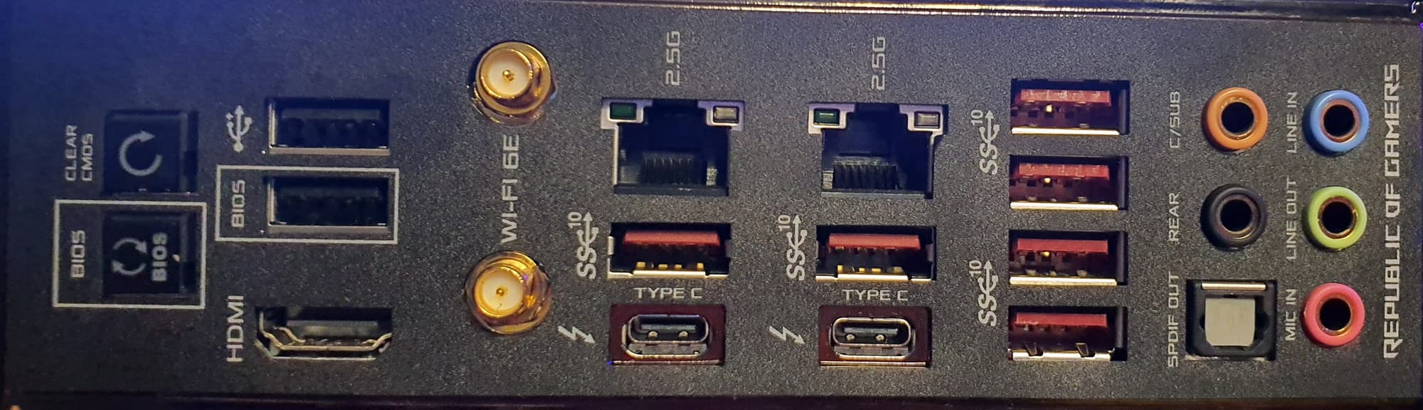 | Разъемы на задней панели | 2 × USB 3.2 Gen2 (Type-C) 6 × USB 3.2 Gen2 (Type-A) 2 × USB 2.0 (Type-A) 2 × RJ-45 5 аудиоразъемов типа миниджек 1 × S/PDIF (оптический, выход) 1 × HDMI 2.0b 2 антенных разъема кнопка сброса CMOS кнопка перепрошивки BIOS — Flashback |