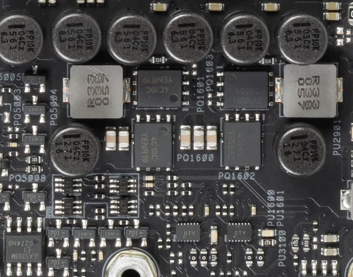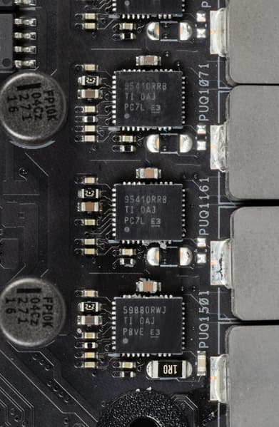 Каждый канал фазы имеет суперферритовый дроссель и X95410RR MOSFET от Texas Instruments на 90 А.