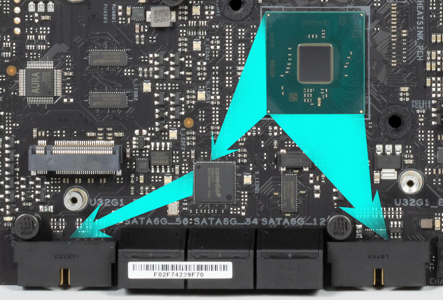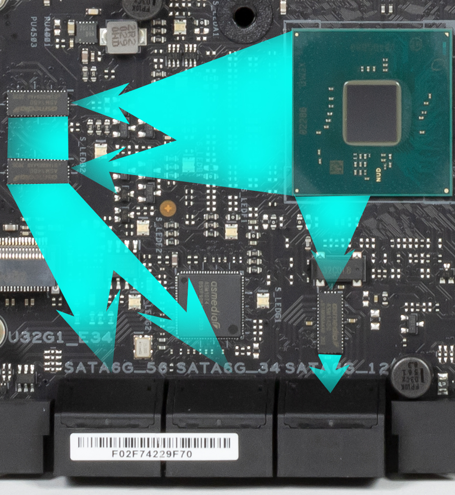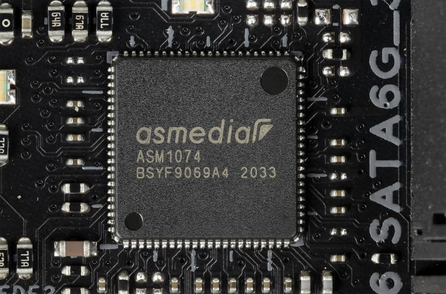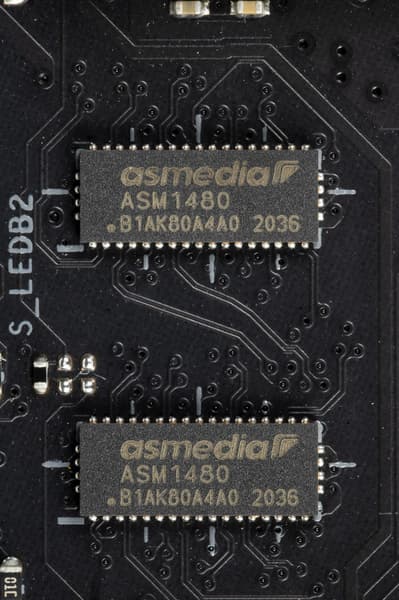 А переключением линий между слотом PCIe x16_3 и портами SATA занимаются мультиплексоры ASM1480 от ASMedia.