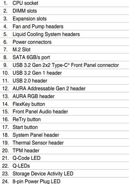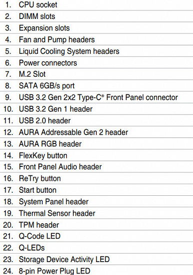 | Прочие внутренние элементы | 24-контактный разъем питания ATX 2 8-контактный разъем питания EPS12V 1 слот M.2 (E-key), занят адаптером беспроводных сетей 1 разъем для подключения порта USB 3.2 Gen2x2 Type-C 2 разъема для подключения 4 портов USB 3.2 Gen1 2 разъема для подключения 4 портов USB 2.0 8 разъемов для подключения 4-контактных вентиляторов и помп ЖСО 1 разъем для подключения неадресуемой RGB-ленты 3 разъема для подключения адресуемой ARGB-ленты 1 разъем аудио для передней панели корпуса 1 разъем для сброса CMOS 1 кнопка OC Retry 1 разъем TPM для устройств безопасности 1 разъем для термодатчикa 3 разъемa подключения фирменных помп СВО Asus 2 разъема для подключения управления с передней панели корпуса 1 кнопка включения питания Power 1 кнопка перезагрузки Reset |